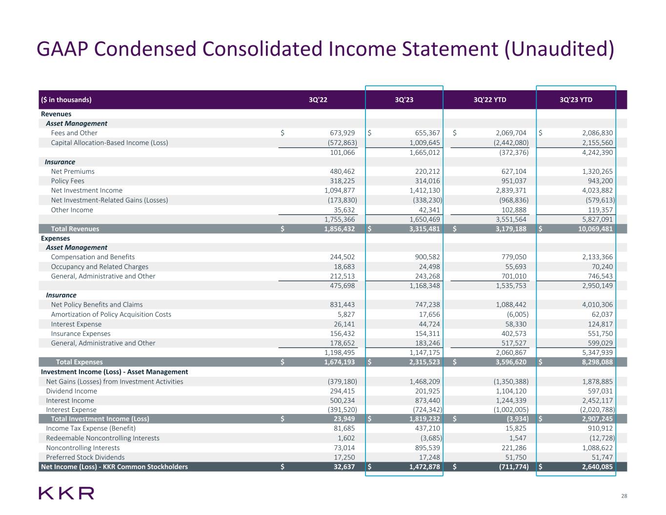 1 Third Quarter 2023 GAAP Results (Unaudited) GAAP Net Income (Loss) Attributable to KKR & Co. Inc. Common Stockholders was $1.5 billion for the quarter. GAAP Stockholders’ Equity Per Outstanding Share of Common Stock was $23.07 at quarter end. ($ in thousands, except per share data) 3Q'22 3Q'23 3Q'22 YTD 3Q'23 YTD Revenues Asset Management $ 101,066 $ 1,665,012 $ (372,376) $ 4,242,390 Insurance 1,755,366 1,650,469 3,551,564 5,827,091 Total Revenues $ 1,856,432 $ 3,315,481 $ 3,179,188 $ 10,069,481 Expenses Asset Management 475,698 1,168,348 1,535,753 2,950,149 Insurance 1,198,495 1,147,175 2,060,867 5,347,939 Total Expenses $ 1,674,193 $ 2,315,523 $ 3,596,620 $ 8,298,088 Total Investment Income (Loss) - Asset Management $ 23,949 $ 1,819,232 $ (3,934) $ 2,907,245 Income Tax Expense (Benefit) 81,685 437,210 15,825 910,912 Redeemable Noncontrolling Interests 1,602 (3,685) 1,547 (12,728) Noncontrolling Interests 73,014 895,539 221,286 1,088,622 Preferred Stock Dividends 17,250 17,248 51,750 51,747 Net Income (Loss) - KKR Common Stockholders $ 32,637 $ 1,472,878 $ (711,774) $ 2,640,085 Net Income (Loss) Attributable to KKR & Co. Inc. Per Share of Common Stock Basic $ 0.04 $ 1.71 $ (1.00) $ 3.06 Diluted $ 0.04 $ 1.64 $ (1.00) $ 2.95 Weighted Average Shares of Common Stock Outstanding Basic 859,833,444 862,123,088 711,908,107 861,598,674 Diluted 886,216,494 909,056,980 711,908,107 911,716,705 4Q'22 3Q'23 KKR & Co. Inc. Stockholders' Equity Per Outstanding Share of Common Stock $ 20.55 $ 23.07 Note: See Appendix for GAAP income statement and GAAP balance sheet. Totals may not add due to rounding in this presentation.