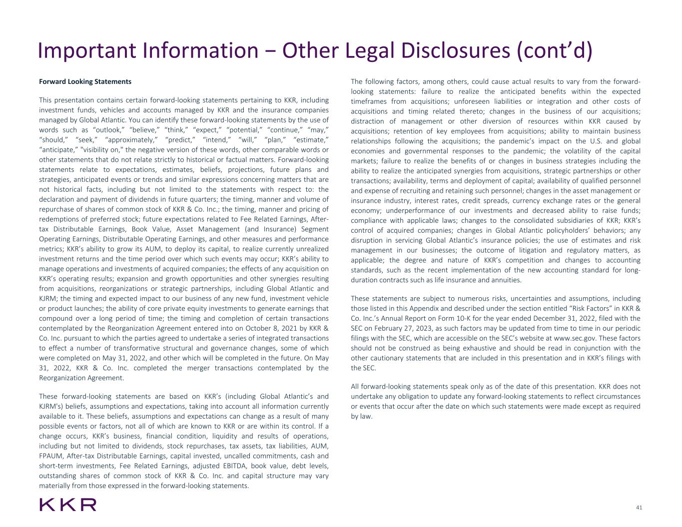 ii Legal Disclosures This presentation has been prepared by KKR & Co. Inc. solely for informational purposes for its public stockholders in connection with evaluating the business, operations and financial results of KKR & Co. Inc. and its subsidiaries (collectively, “KKR”), which includes The Global Atlantic Financial Group LLC and its subsidiaries (collectively, “Global Atlantic”) as of February 1, 2021. This presentation is not and shall not be construed as an offer to purchase or sell, or the solicitation of an offer to purchase or sell any securities of KKR & Co. Inc. This presentation may not be distributed, referenced, quoted or linked by website, in whole or in part, except as agreed to in writing by KKR & Co. Inc. The statements contained in this presentation are made as of the date of this presentation (other than financial figures, which are as of quarter end), unless another time is specified in relation to them, and access to this presentation at any given time shall not give rise to any implication that there has been no change in the facts set forth in this presentation since that date. This presentation contains certain forward-looking statements pertaining to KKR, including with respect to the investment funds, vehicles and accounts managed by KKR and the insurance companies managed by Global Atlantic. Forward-looking statements relate to expectations, estimates, beliefs, projections, future plans and strategies, anticipated events or trends and similar expressions concerning matters that are not historical facts. You can identify these forward-looking statements by the use of words such as "outlook," "believe," “think,” "expect," "potential," "continue," "may," "should," "seek," "approximately," "predict," "intend," "will," "plan," "estimate,“ "anticipate," "visibility on," the negative version of these words, other comparable words or other statements that do not relate strictly to historical or factual matters. These forward- looking statements are based on KKR’s beliefs, assumptions and expectations, but these beliefs, assumptions and expectations can change as a result of many possible events or factors, not all of which are known to KKR or within its control. Due to various risks and uncertainties, actual events or results may differ materially from those reflected or contemplated in such forward-looking statements. Past performance is no guarantee of future results. All forward-looking statements speak only as of the date of this presentation. KKR does not undertake any obligation to update any forward-looking statements to reflect circumstances or events that occur after the date of this presentation except as required by law. Please see the Appendix for additional important information about forward looking statements, including the assumptions and risks concerning projections and estimates of future performance. This presentation includes certain non-GAAP measures, including after-tax distributable earnings (or DE), fee related earnings (or FRE), and book value. These non-GAAP measures are in addition to, and not a substitute for, measures of financial and operating performance prepared in accordance with U.S. GAAP. While we believe that providing these non-GAAP measures is helpful to investors in assessing the overall performance of KKR’s business, they may not include all items that are significant to an investor’s analysis of our financial results. Please see the Appendix for additional important information about the non-GAAP measures presented herein and a reconciliation of non-GAAP measures to comparable GAAP measures. Please see the Appendix for other important information. In addition, information about factors affecting KKR, including a description of risks that should be considered when making a decision to purchase or sell any securities of KKR & Co. Inc., can be found in KKR & Co. Inc.’s Annual Report on Form 10-K for the fiscal year ended December 31, 2022, filed with the SEC on February 27, 2023 and its other filings with the SEC, which are available at www.sec.gov. From time to time, we may use our website as a channel of distribution of material information. Financial and other material information regarding KKR is routinely posted on and accessible at www.kkr.com. Financial and other material information regarding Global Atlantic is routinely posted on and accessible at www.globalatlantic.com. Information on these websites are not incorporated by reference herein and are not a part of this presentation. Contact Information KKR Reports Third Quarter 2023 Financial Results Investor Relations Craig Larson Phone: +1 (877) 610-4910 in U.S. / +1 (212) 230-9410 investor-relations@kkr.com Media Kristi Huller Phone: +1 (212) 750-8300 media@kkr.com