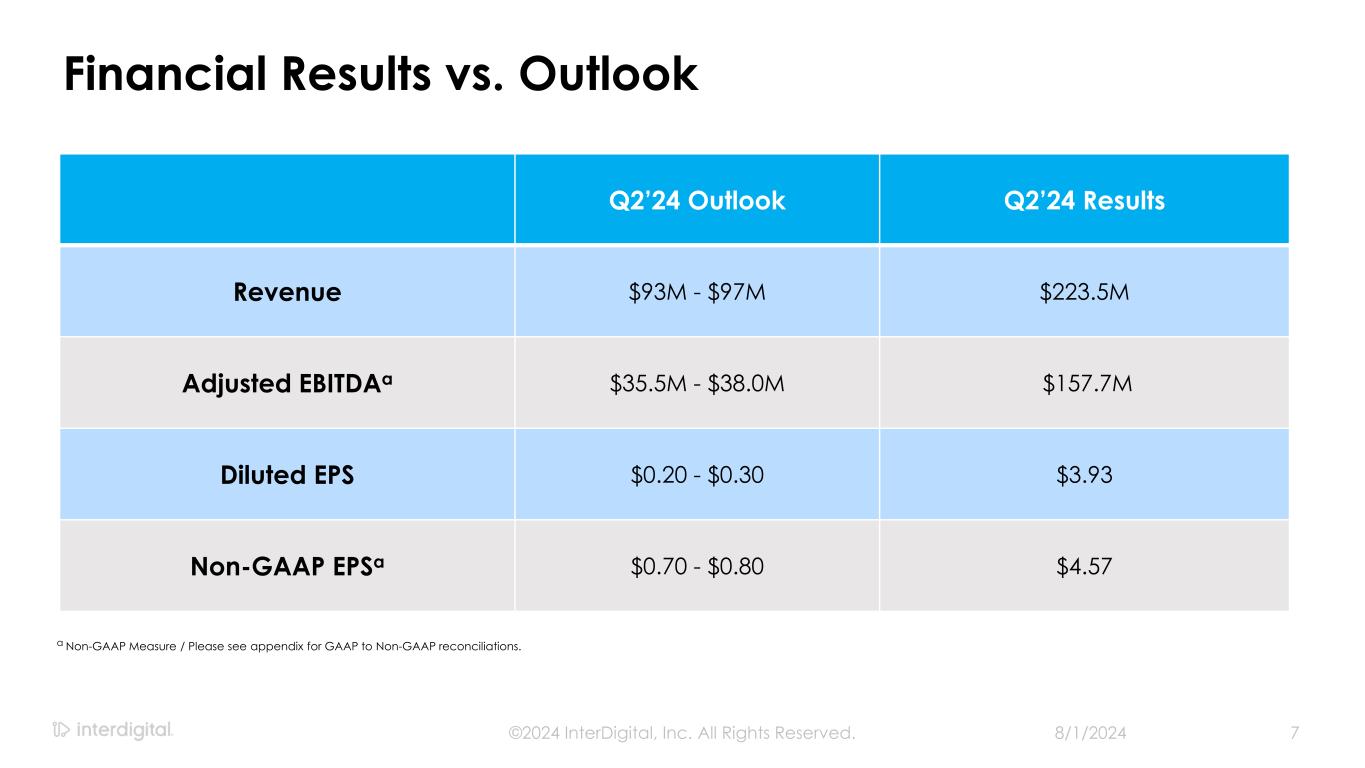 WILMINGTON, DE. - August 1, 2024 - InterDigital, Inc. (Nasdaq: IDCC), a mobile, video, and AI technology research and development company, today announced results for the quarter ended June 30, 2024.