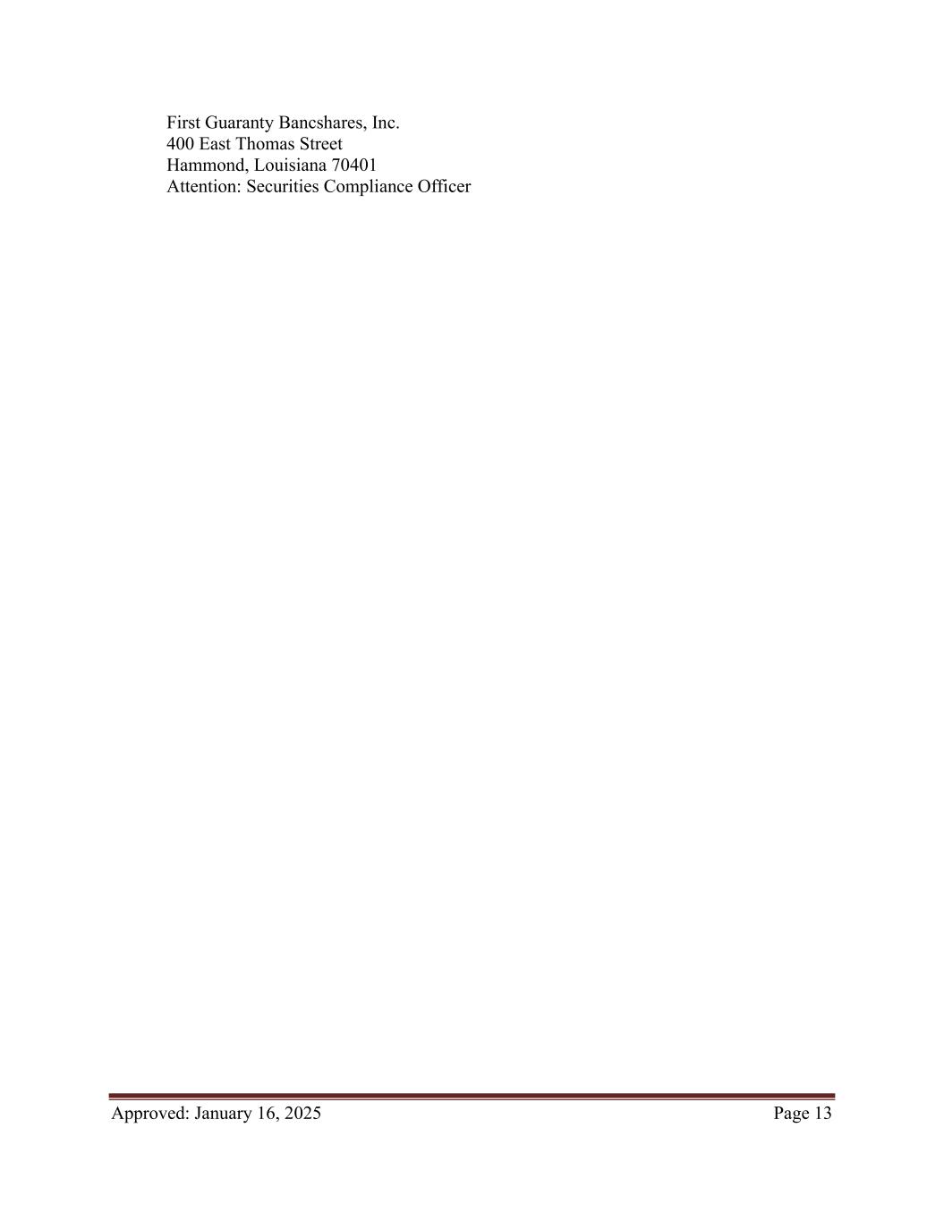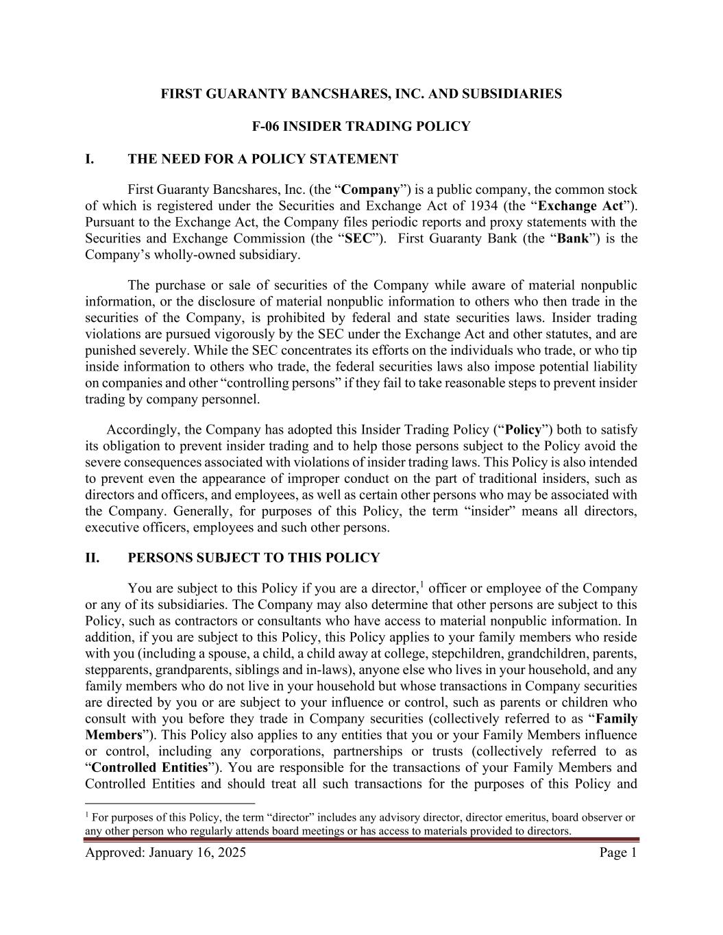 In accordance with the applicable rules of the Nasdaq Stock Market (the “Nasdaq Rules”), Section 10D and Rule 10D-1 of the Securities Exchange Act of 1934, as amended (the “Exchange Act”), the Board of First Guaranty Bancshares, Inc. (the “Company”) has adopted this Policy (the “Policy”) to provide for the recovery of erroneously awarded Covered Compensation (as defined herein) from executive officers of the Company or its wholly-owned subsidiary, First Guaranty Bank (collectively, “Executive Officers”). All capitalized terms used and not otherwise defined herein shall have the meanings set forth in Section V below.