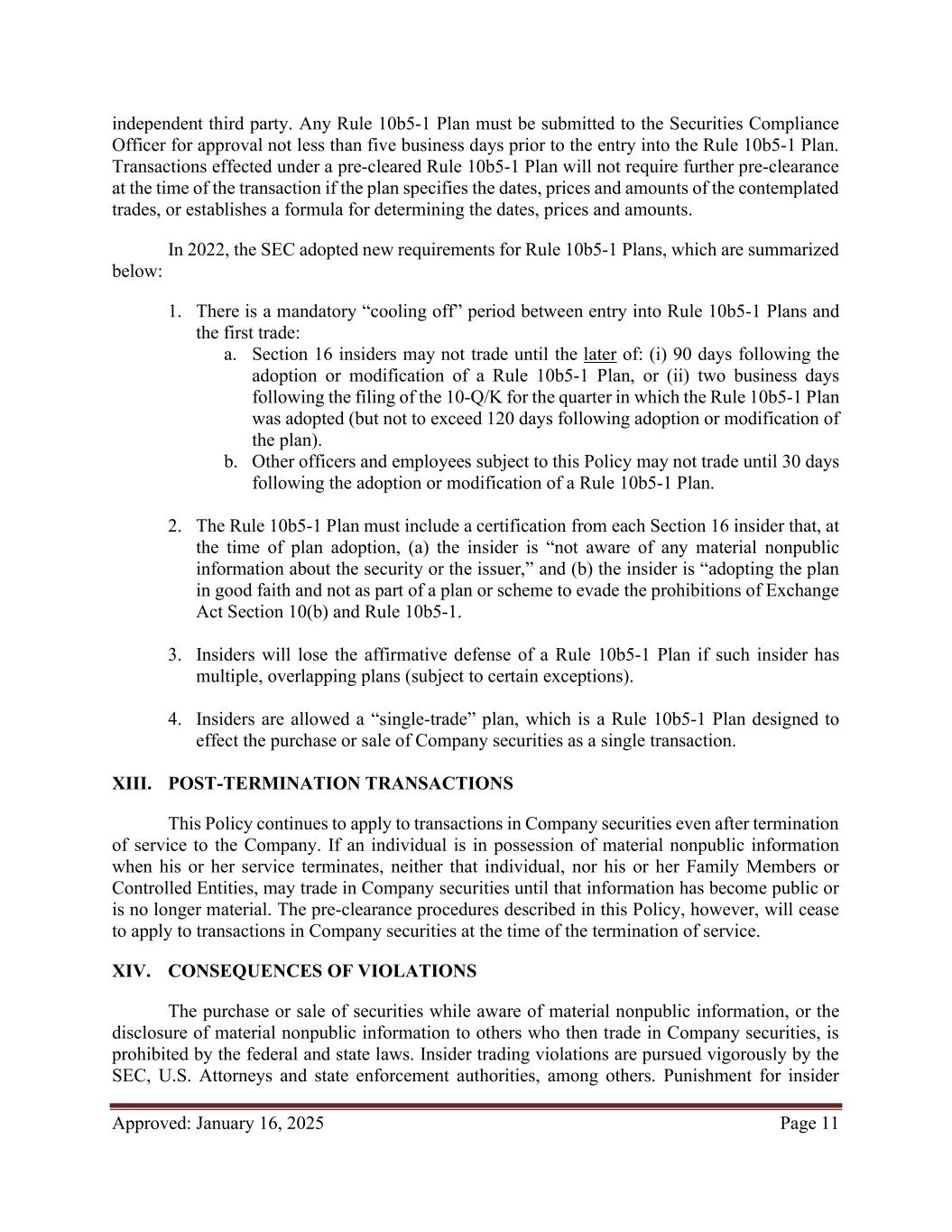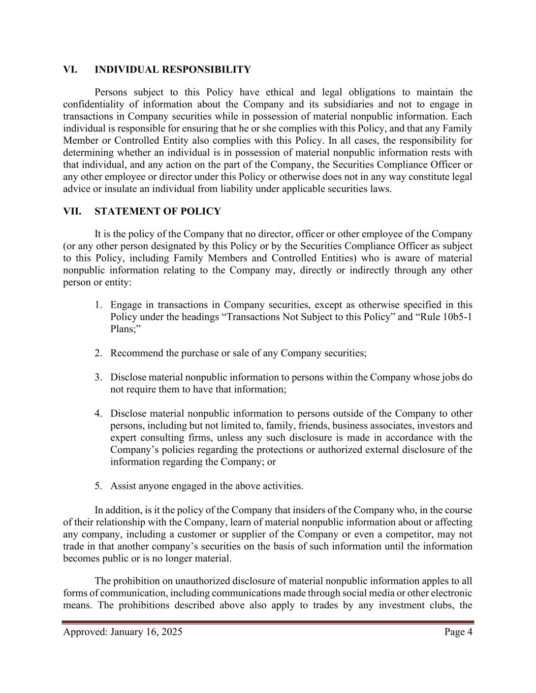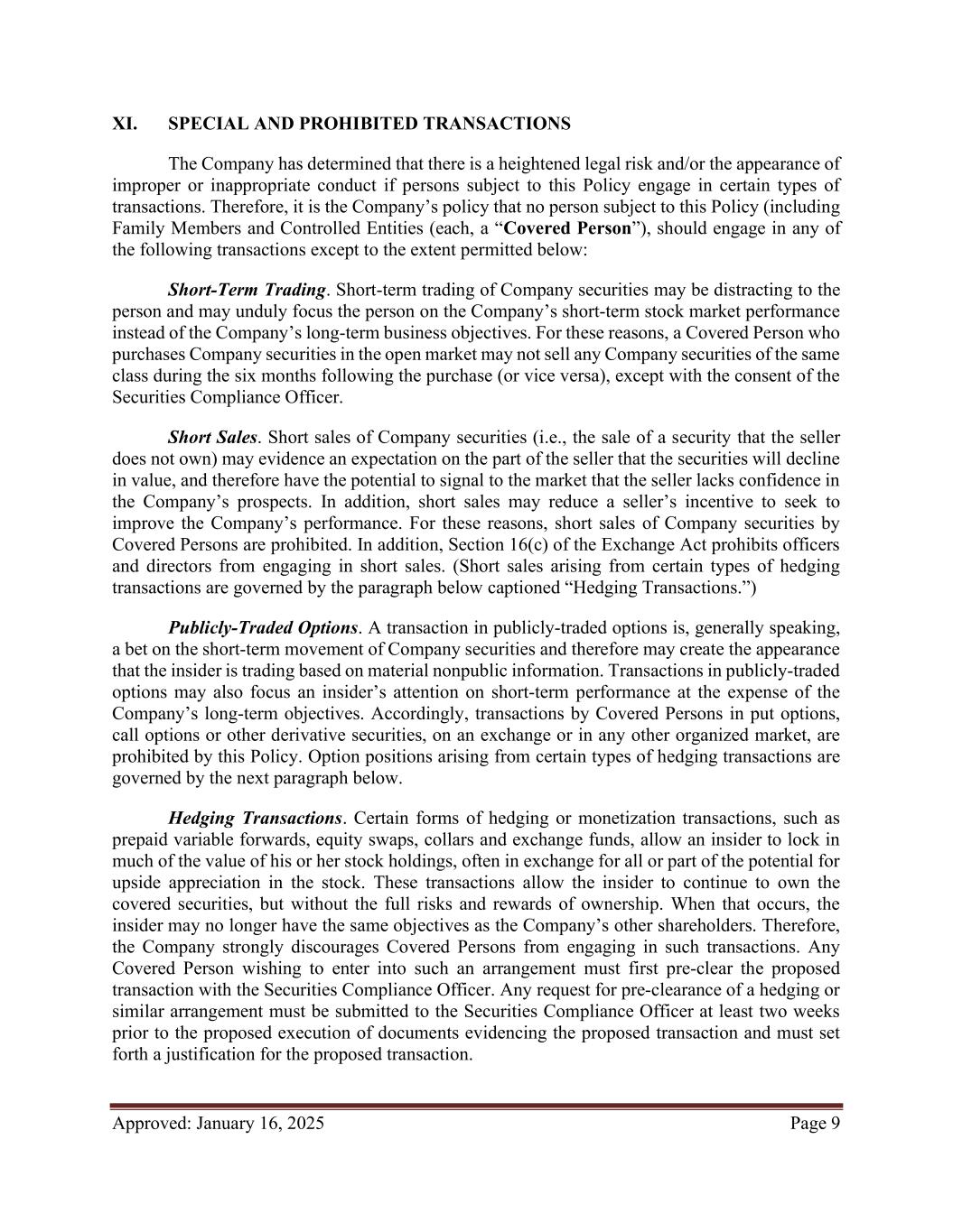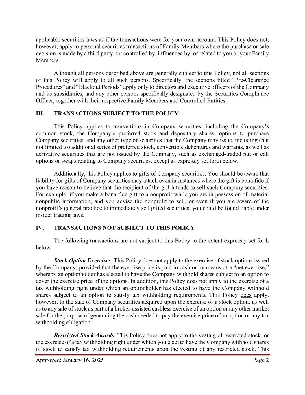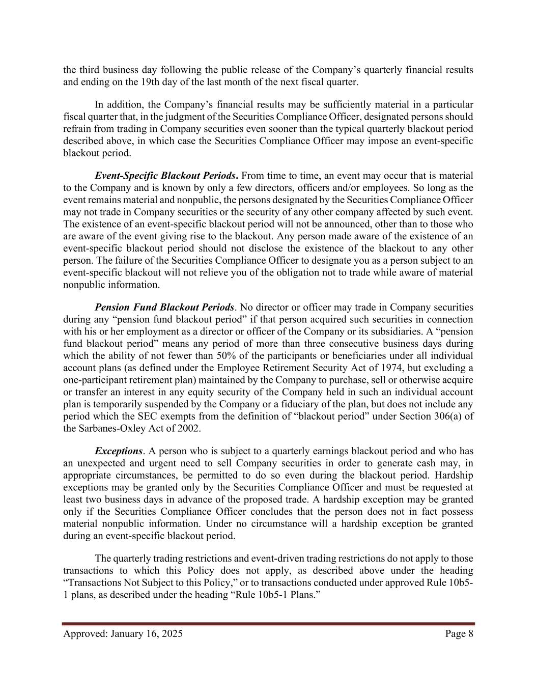 a.“Restatement” means any required accounting restatement (occurring after the effective date of this Policy) or any of the Company’s consolidated financial statements that have been filed with the SEC, due to material non-compliance with any financial reporting requirement under the Exchange Act or the Securities Act of 1933, as amended, to correct an error in previously issued financial statements that is material to the previously issued financial statements, or that would result in a material misstatement if that error were corrected in the current period or left uncorrected in the current period. For purposes hereof, the Company will be deemed to have been “required” to prepare an accounting restatement on the date that is the earlier of (i) the date the Board, any committee thereof or any officers of the Company authorized to take such action concludes, or reasonably should have concluded, that the Company is required to prepare an accounting restatement due to material noncompliance with any financial reporting requirements under the federal securities laws or (ii) the date a court, regulator or other legally authorized body directs the Company to prepare an accounting restatement.