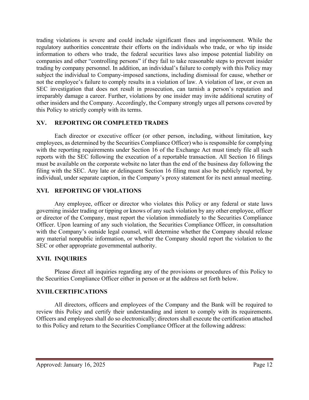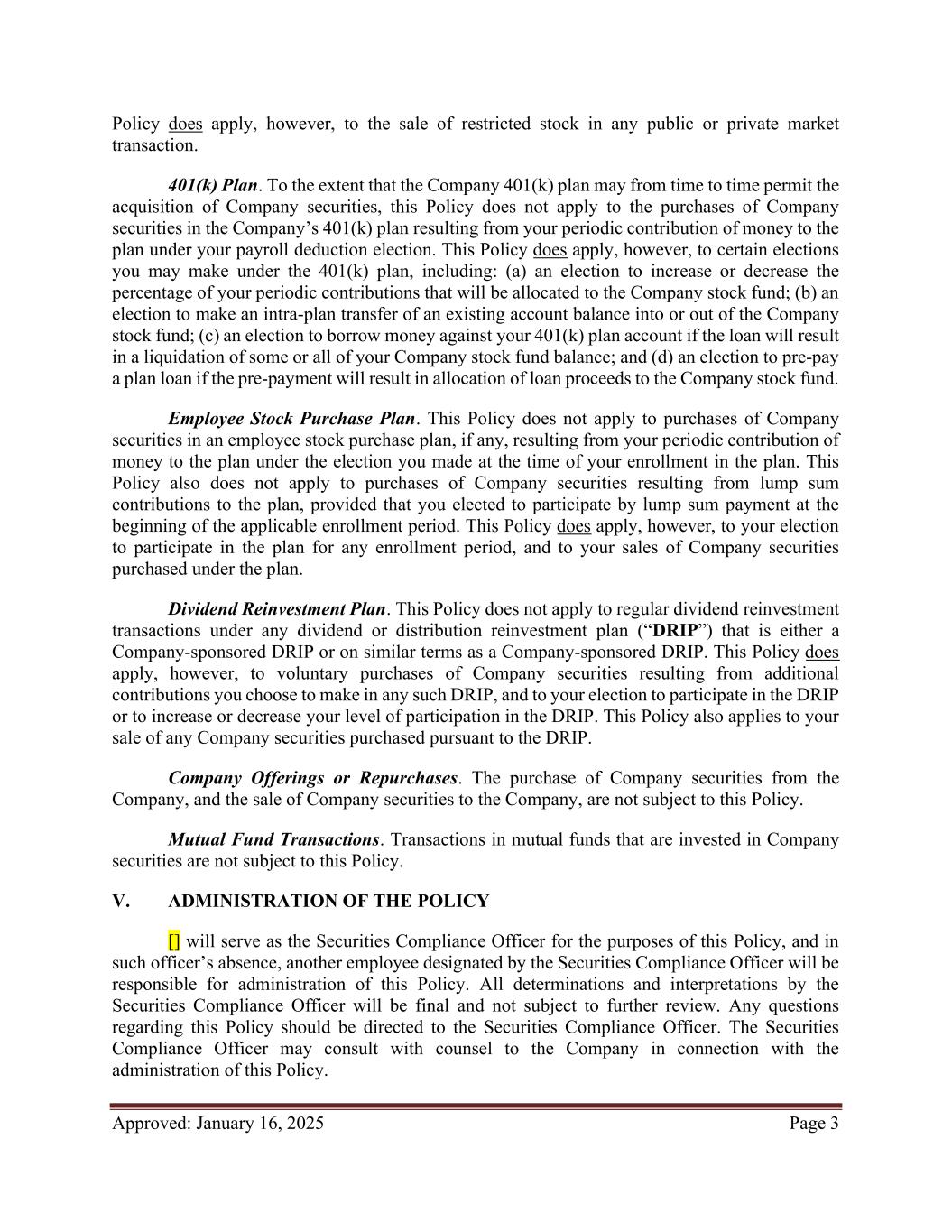 For the avoidance of doubt, if the conditions necessary to trigger a Restatement Clawback exist, the Board is required to seek reimbursement of the applicable amount of Covered Compensation under this policy, without giving consideration to any mitigating circumstances, including the relative culpability, if any, of the impacted Executive Officer(s) in the events that gave rise to the triggering Restatement. Notwithstanding the foregoing, if in connection with a Restatement Clawback: (i) after making a reasonable attempt to recover the excess Covered Compensation, the Board reasonably determines that the direct expense to be paid to a third party to recover such excess Covered Compensation would exceed the amount of the Covered Compensation to be recovered and, therefore, that recovery is impracticable, or (ii) the recovery of the Covered Compensation would cause the Company’s tax qualified retirement plan to fail to meet the requirements of Internal Revenue Code Section 401(a)(13), then in each case, the Company will not be required to seek recovery hereunder.