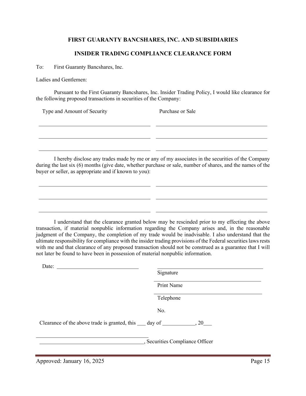 I, the undersigned Executive Officer of the Company, agree and acknowledge that I am fully bound by, and subject to, all of the terms and conditions of the First Guaranty Bancshares, Inc. Clawback Policy (as may be amended, restated, supplemented or otherwise modified from time to time, the “Policy”). In the event of any inconsistency between the Policy and the terms of any employment agreement (or similar arrangement) to which I am a party, or the terms of any compensation plan, program or agreement under which any compensation has been granted, awarded, earned or paid, the terms of the Policy shall govern (except with respect to an Improper Conduct clawback). In the event it is determined by the Board that any amounts granted, awarded, earned or paid to me must be forfeited or reimbursed to the Company, I will promptly take any action necessary to effectuate such forfeiture and/or reimbursement. Any capitalized terms used in this Acknowledgment without definition shall have the meaning set forth in the Policy.