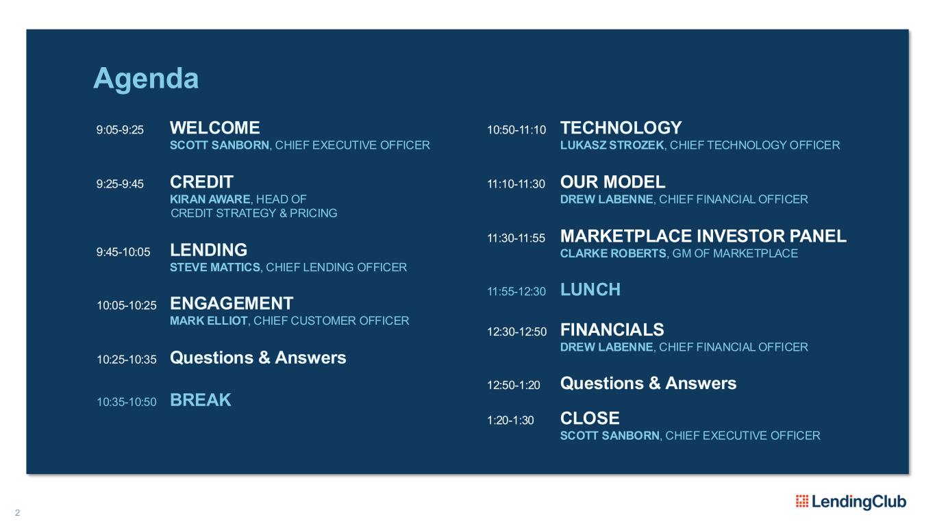 2 9:05-9:25 WELCOME SCOTT SANBORN, CHIEF EXECUTIVE OFFICER 9:25-9:45 CREDIT KIRAN AWARE, HEAD OF CREDIT STRATEGY & PRICING 9:45-10:05 LENDING STEVE MATTICS, CHIEF LENDING OFFICER 10:05-10:25 ENGAGEMENT MARK ELLIOT, CHIEF CUSTOMER OFFICER 10:25-10:35 Questions & Answers 10:35-10:50 BREAK 10:50-11:10 TECHNOLOGY LUKASZ STROZEK, CHIEF TECHNOLOGY OFFICER 11:10-11:30 OUR MODEL DREW LABENNE, CHIEF FINANCIAL OFFICER 11:30-11:55 MARKETPLACE INVESTOR PANEL CLARKE ROBERTS, GM OF MARKETPLACE 11:55-12:30 LUNCH 12:30-12:50 FINANCIALS DREW LABENNE, CHIEF FINANCIAL OFFICER 12:50-1:20 Questions & Answers 1:20-1:30 CLOSE SCOTT SANBORN, CHIEF EXECUTIVE OFFICER Agenda
