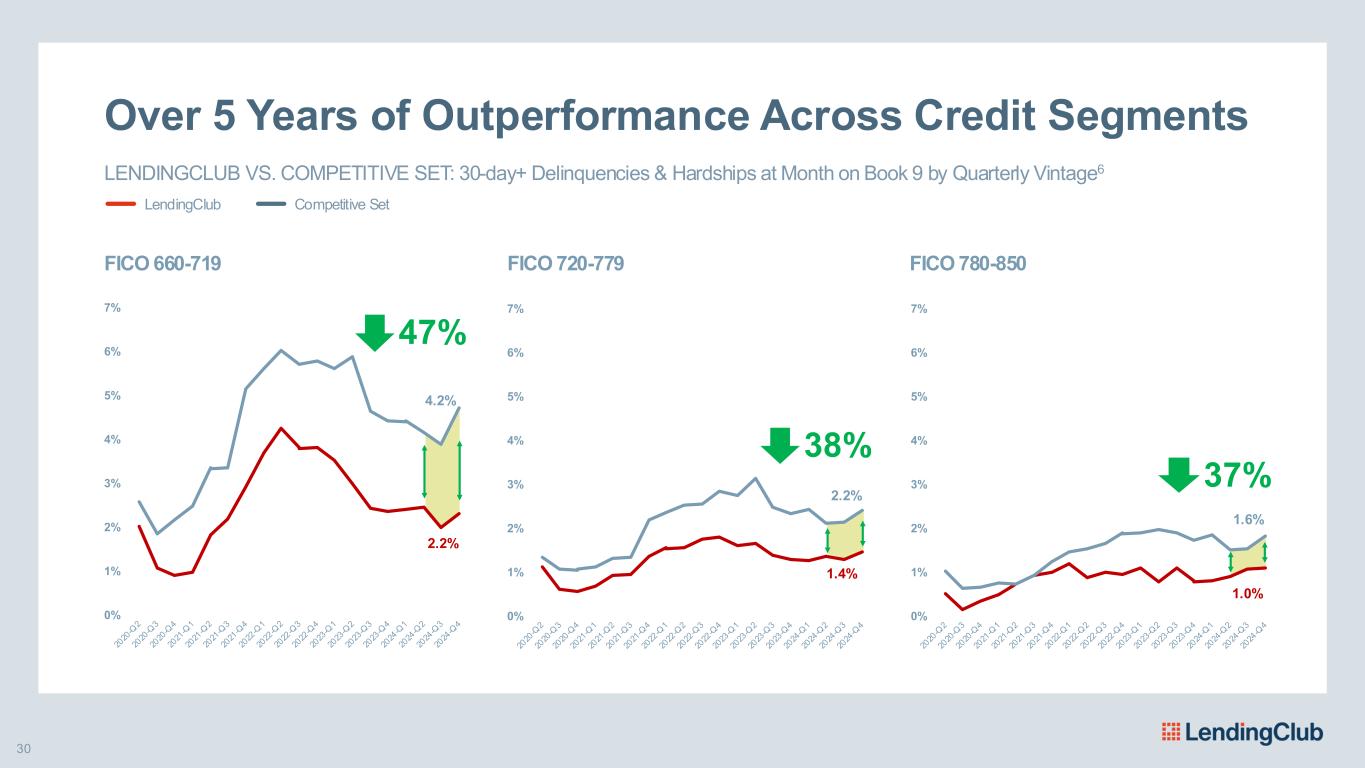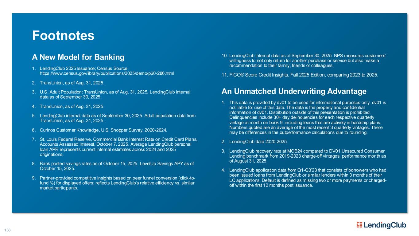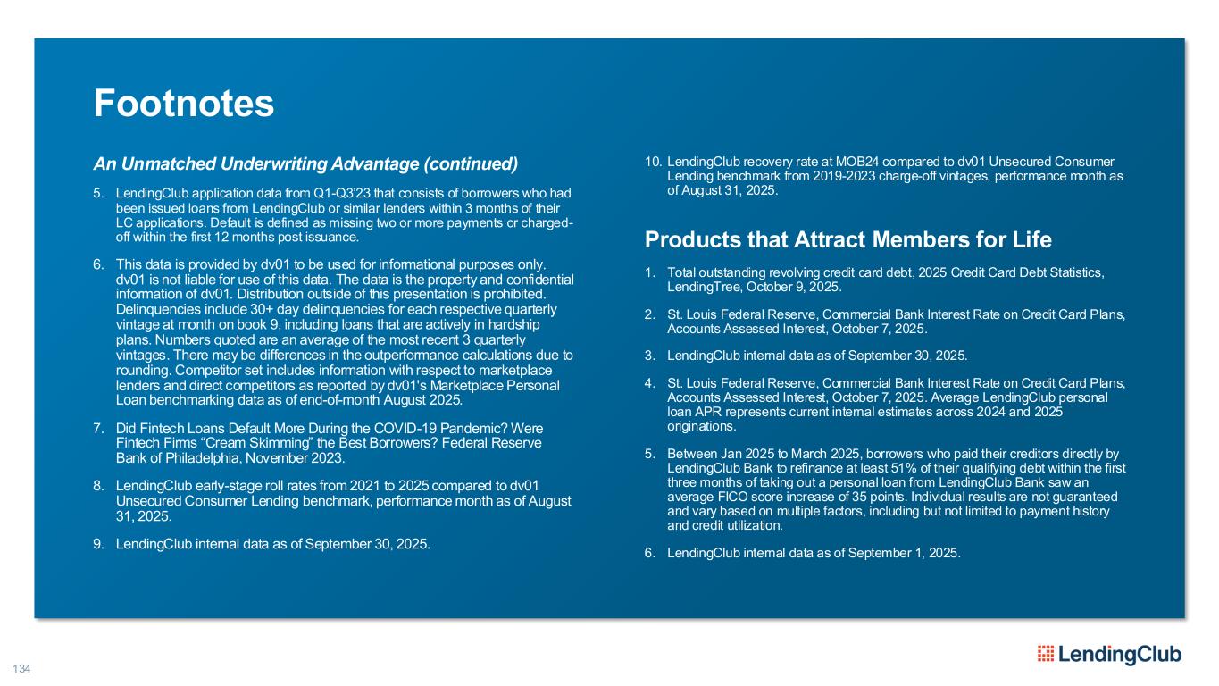 133 Footnotes A New Model for Banking 1. LendingClub 2025 Issuance; Census Source: https://www.census.gov/library/publications/2025/demo/p60-286.html 2. TransUnion, as of Aug. 31, 2025. 3. U.S. Adult Population: TransUnion, as of Aug. 31, 2025. LendingClub internal data as of September 30, 2025. 4. TransUnion, as of Aug. 31, 2025. 5. LendingClub internal data as of September 30, 2025. Adult population data from TransUnion, as of Aug. 31, 2025. 6. Curinos Customer Knowledge, U.S. Shopper Survey, 2020-2024. 7. St. Louis Federal Reserve, Commercial Bank Interest Rate on Credit Card Plans, Accounts Assessed Interest, October 7, 2025. Average LendingClub personal loan APR represents current internal estimates across 2024 and 2025 originations. 8. Bank posted savings rates as of October 15, 2025. LevelUp Savings APY as of October 15, 2025. 9. Partner-provided competitive insights based on peer funnel conversion (click-to- fund %) for displayed offers; reflects LendingClub’s relative efficiency vs. similar market participants. 10. LendingClub internal data as of September 30, 2025. NPS measures customers’ willingness to not only return for another purchase or service but also make a recommendation to their family, friends or colleagues. 11. FICO® Score Credit Insights, Fall 2025 Edition, comparing 2023 to 2025. An Unmatched Underwriting Advantage 1. This data is provided by dv01 to be used for informational purposes only. dv01 is not liable for use of this data. The data is the property and confidential information of dv01. Distribution outside of this presentation is prohibited. Delinquencies include 30+ day delinquencies for each respective quarterly vintage at month on book 9, including loans that are actively in hardship plans. Numbers quoted are an average of the most recent 3 quarterly vintages. There may be differences in the outperformance calculations due to rounding. 2. LendingClub data 2020-2025. 3. LendingClub recovery rate at MOB24 compared to DV01 Unsecured Consumer Lending benchmark from 2019-2023 charge-off vintages, performance month as of August 31, 2025. 4. LendingClub application data from Q1-Q3’23 that consists of borrowers who had been issued loans from LendingClub or similar lenders within 3 months of their LC applications. Default is defined as missing two or more payments or charged- off within the first 12 months post issuance.