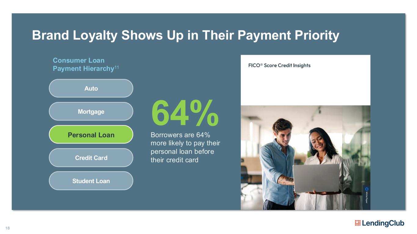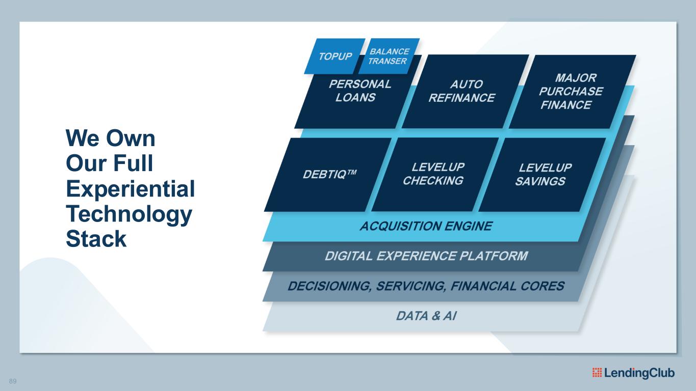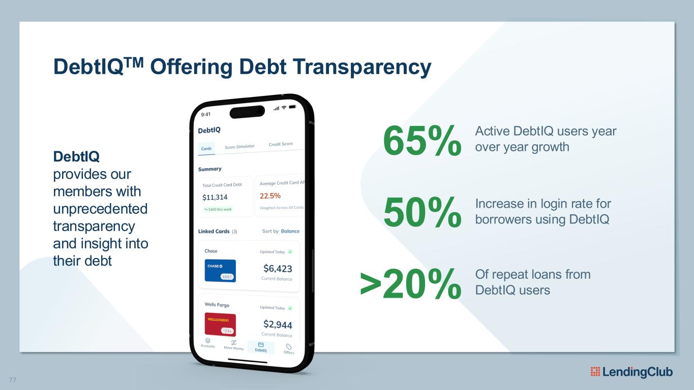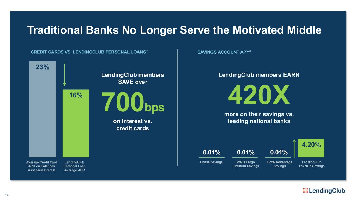 133 Footnotes A New Model for Banking 1. LendingClub 2025 Issuance; Census Source: https://www.census.gov/library/publications/2025/demo/p60-286.html 2. TransUnion, as of Aug. 31, 2025. 3. U.S. Adult Population: TransUnion, as of Aug. 31, 2025. LendingClub internal data as of September 30, 2025. 4. TransUnion, as of Aug. 31, 2025. 5. LendingClub internal data as of September 30, 2025. Adult population data from TransUnion, as of Aug. 31, 2025. 6. Curinos Customer Knowledge, U.S. Shopper Survey, 2020-2024. 7. St. Louis Federal Reserve, Commercial Bank Interest Rate on Credit Card Plans, Accounts Assessed Interest, October 7, 2025. Average LendingClub personal loan APR represents current internal estimates across 2024 and 2025 originations. 8. Bank posted savings rates as of October 15, 2025. LevelUp Savings APY as of October 15, 2025. 9. Partner-provided competitive insights based on peer funnel conversion (click-to- fund %) for displayed offers; reflects LendingClub’s relative efficiency vs. similar market participants. 10. LendingClub internal data as of September 30, 2025. NPS measures customers’ willingness to not only return for another purchase or service but also make a recommendation to their family, friends or colleagues. 11. FICO® Score Credit Insights, Fall 2025 Edition, comparing 2023 to 2025. An Unmatched Underwriting Advantage 1. This data is provided by dv01 to be used for informational purposes only. dv01 is not liable for use of this data. The data is the property and confidential information of dv01. Distribution outside of this presentation is prohibited. Delinquencies include 30+ day delinquencies for each respective quarterly vintage at month on book 9, including loans that are actively in hardship plans. Numbers quoted are an average of the most recent 3 quarterly vintages. There may be differences in the outperformance calculations due to rounding. 2. LendingClub data 2020-2025. 3. LendingClub recovery rate at MOB24 compared to DV01 Unsecured Consumer Lending benchmark from 2019-2023 charge-off vintages, performance month as of August 31, 2025. 4. LendingClub application data from Q1-Q3’23 that consists of borrowers who had been issued loans from LendingClub or similar lenders within 3 months of their LC applications. Default is defined as missing two or more payments or charged- off within the first 12 months post issuance.