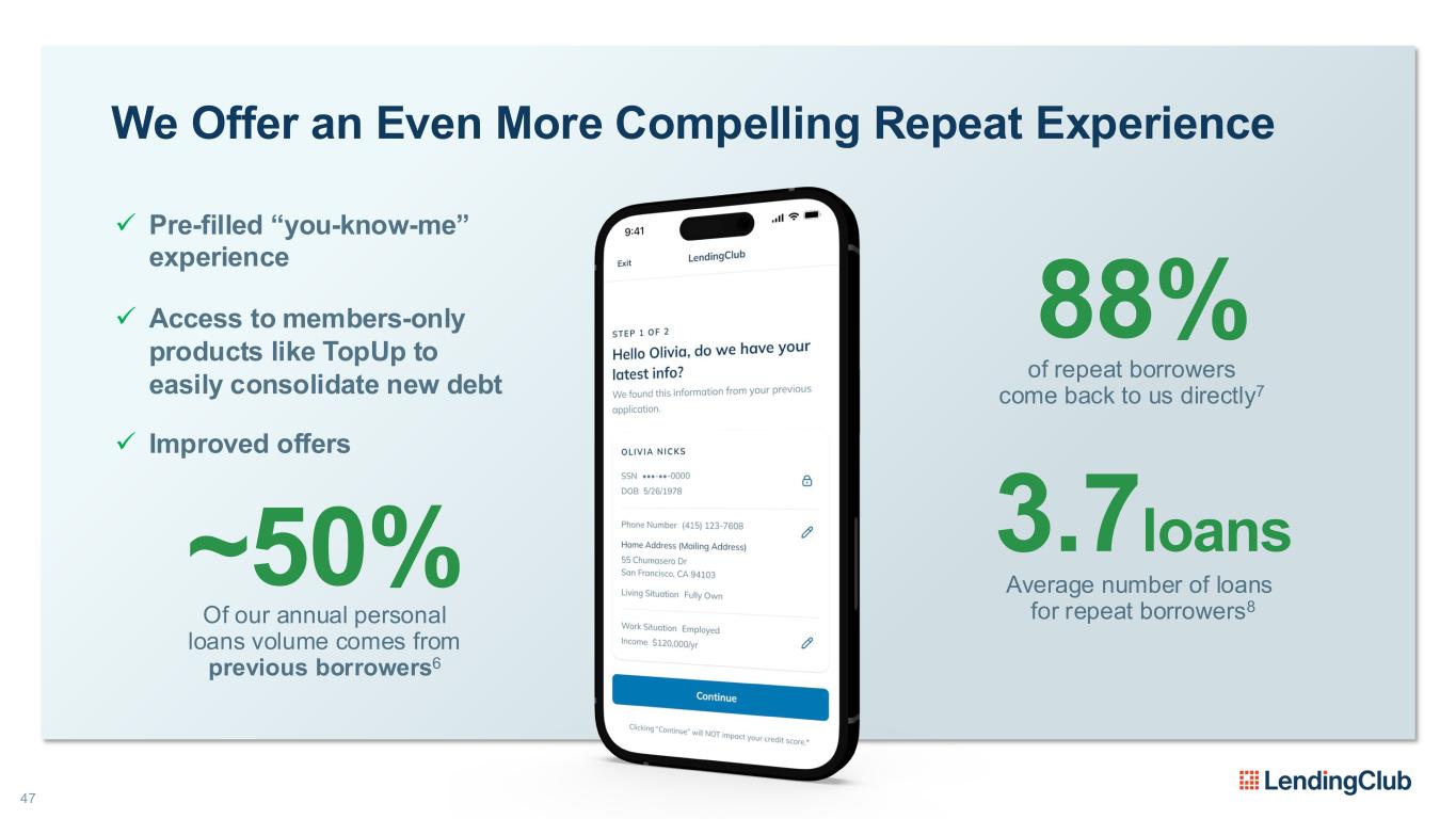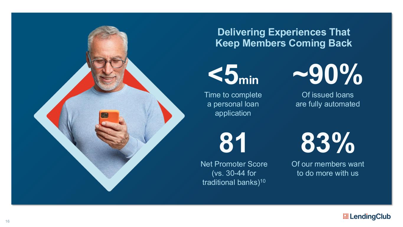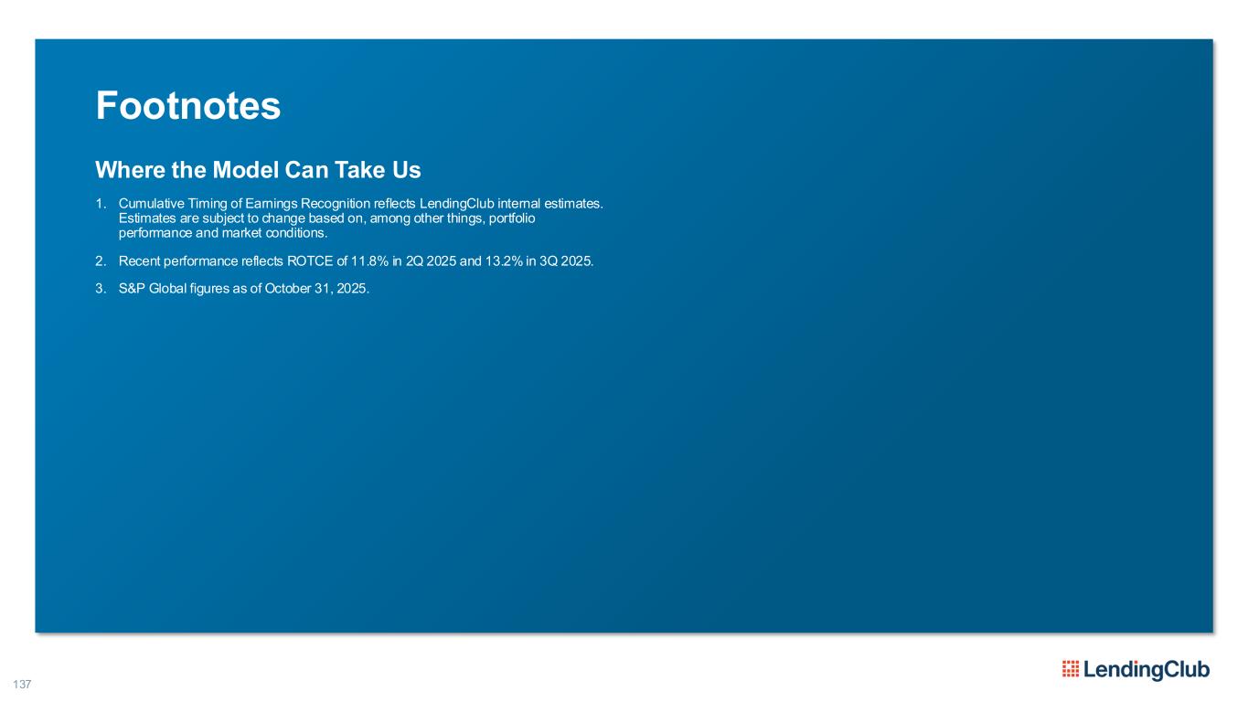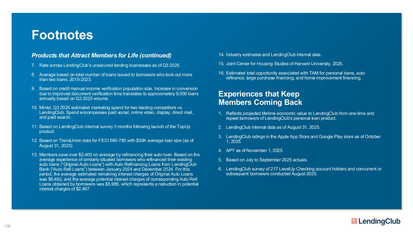 135 Footnotes Products that Attract Members for Life (continued) 7. Rate across LendingClub’s unsecured lending businesses as of Q3 2025. 8. Average based on total number of loans issued to borrowers who took out more than two loans, 2015-2023. 9. Based on credit manual income verification population size. Increase in conversion due to improved document verification time translates to approximately 9,000 loans annually based on Q3 2025 volume. 10. Mintel, Q3 2025 estimated marketing spend for two leading competitors vs. LendingClub. Spend encompasses paid social, online video, display, direct mail, and paid search. 11. Based on LendingClub internal survey 3 months following launch of the TopUp product. 12. Based on TransUnion data for FICO 660-780 with $30K average loan size (as of August 31, 2025) 13. Members save over $2,400 on average by refinancing their auto loan. Based on the average experience of similarly situated borrowers who refinanced their existing auto loans (“Original Auto Loans”) with Auto Refinancing Loans from LendingClub Bank (“Auto Refi Loans”) between January 2024 and December 2024. For this period, the average estimated remaining interest charges of Original Auto Loans was $8,482, and the average potential interest charges of corresponding Auto Refi Loans obtained by borrowers was $5,985, which represents a reduction in potential interest charges of $2,497. 14. Industry estimates and LendingClub internal data. 15. Joint Center for Housing Studies of Harvard University, 2025. 16. Estimated total opportunity associated with TAM for personal loans, auto refinance, large purchase financing, and home improvement financing. Experiences that Keep Members Coming Back 1. Reflects projected lifetime economic value to LendingClub from one-time and repeat borrowers of LendingClub's personal loan product. 2. LendingClub internal data as of August 31, 2025. 3. LendingClub ratings in the Apple App Store and Google Play store as of October 1, 2025. 4. APY as of November 1, 2025. 5. Based on July to September 2025 actuals. 6. LendingClub survey of 217 LevelUp Checking account holders and concurrent or subsequent borrowers conducted August 2025.