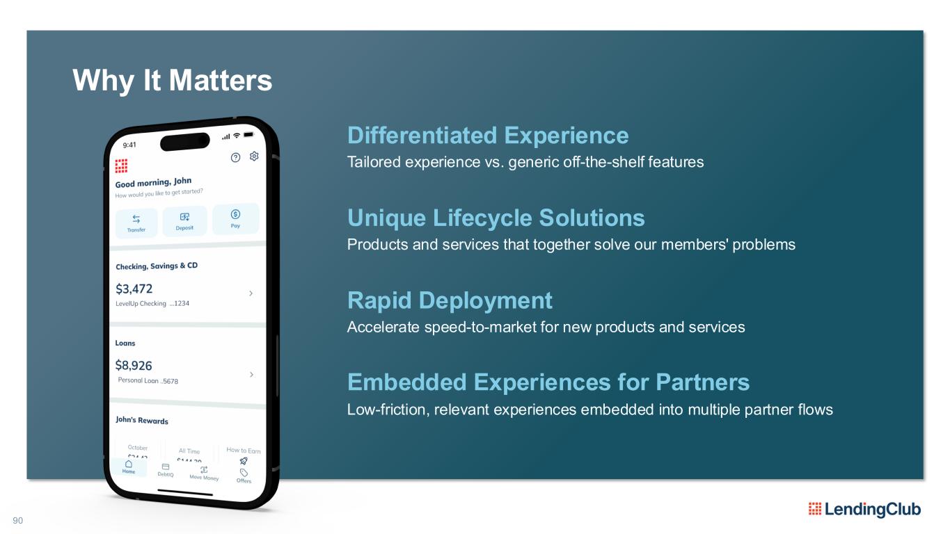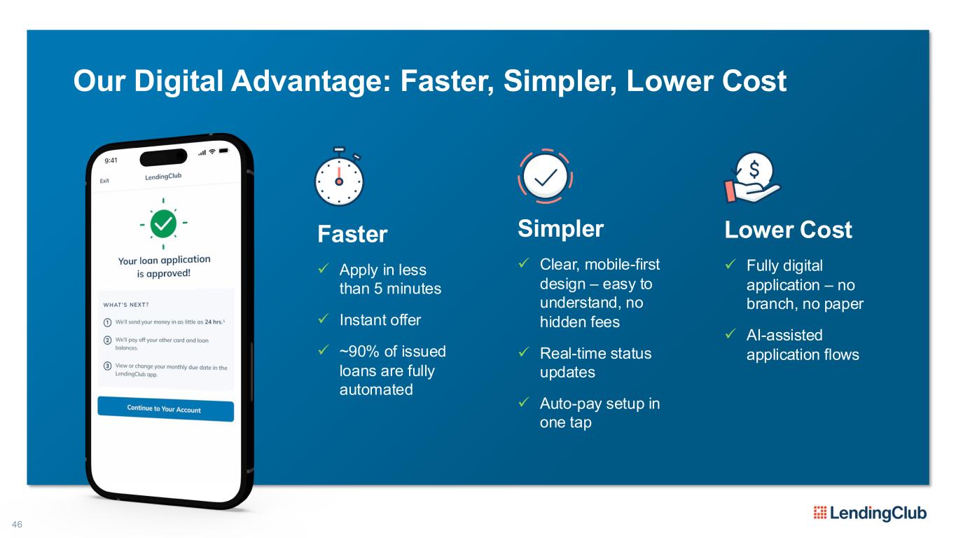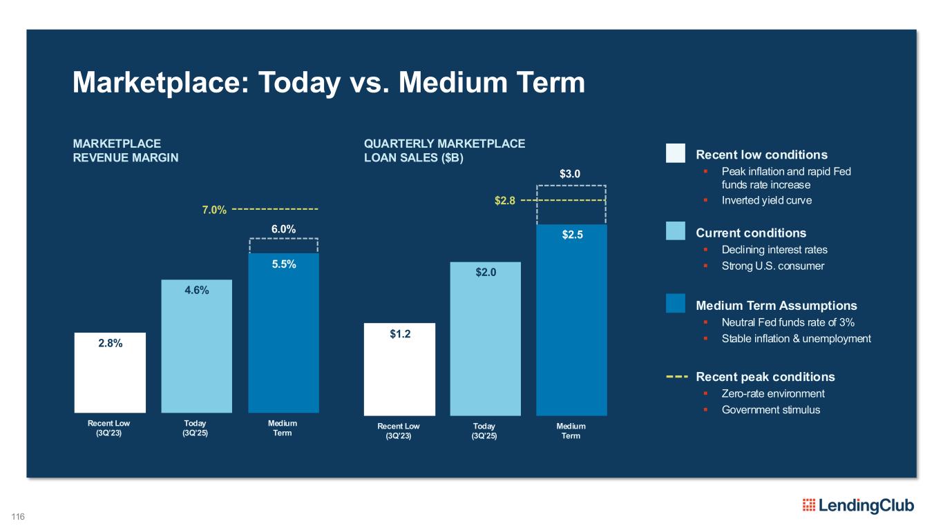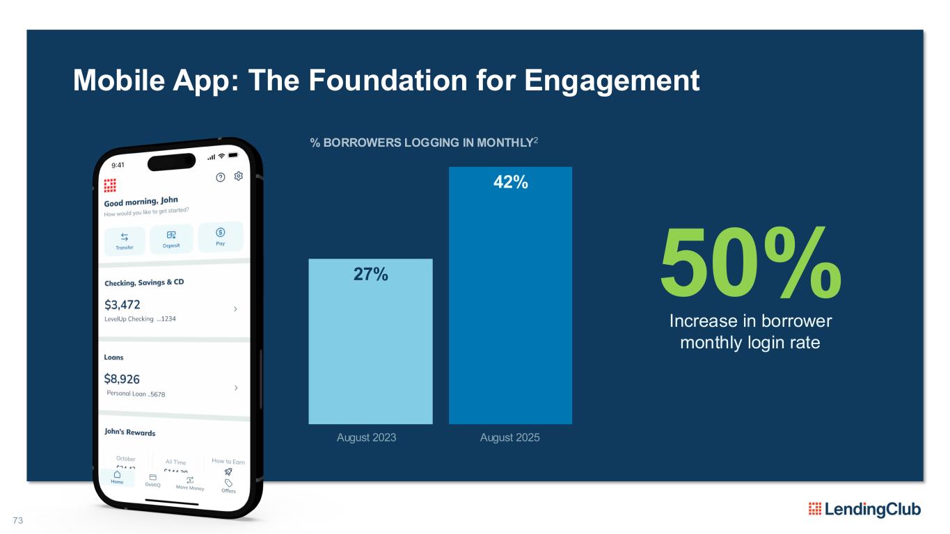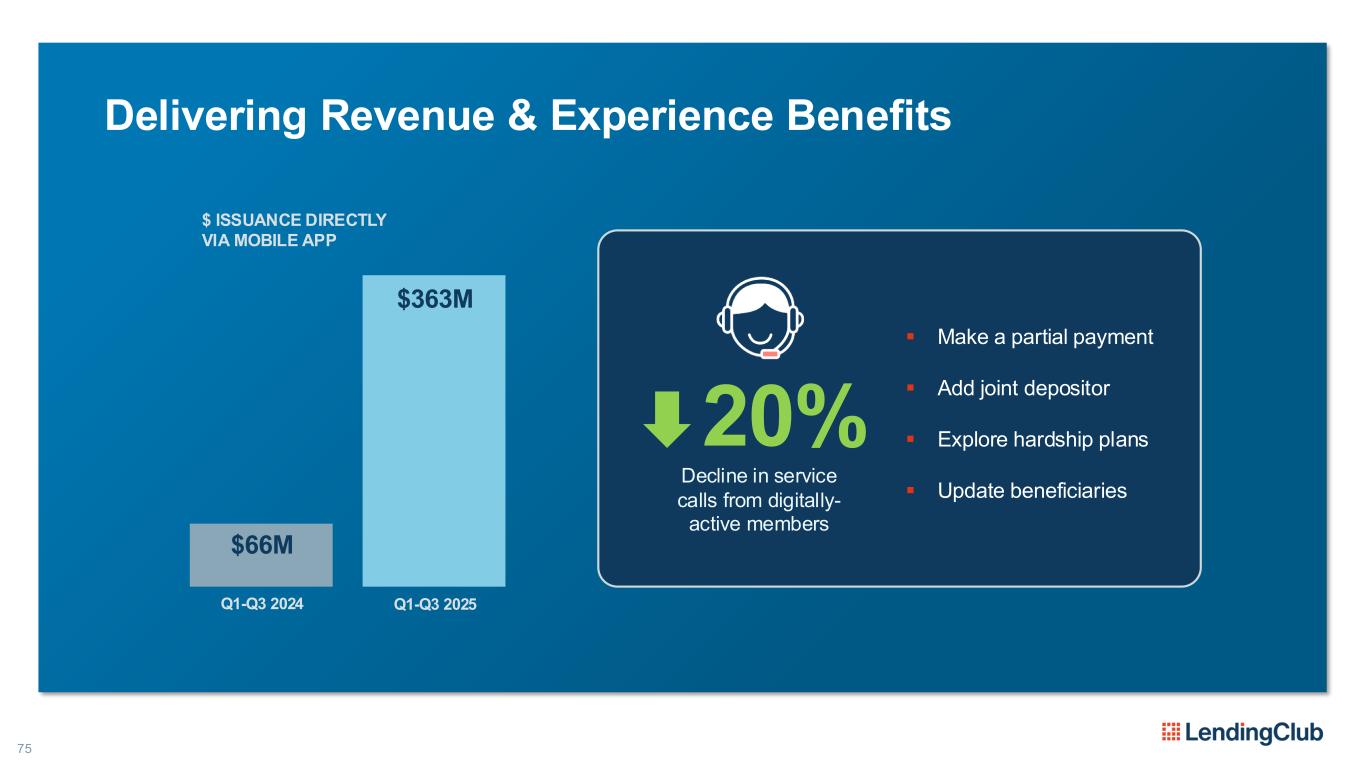 135 Footnotes Products that Attract Members for Life (continued) 7. Rate across LendingClub’s unsecured lending businesses as of Q3 2025. 8. Average based on total number of loans issued to borrowers who took out more than two loans, 2015-2023. 9. Based on credit manual income verification population size. Increase in conversion due to improved document verification time translates to approximately 9,000 loans annually based on Q3 2025 volume. 10. Mintel, Q3 2025 estimated marketing spend for two leading competitors vs. LendingClub. Spend encompasses paid social, online video, display, direct mail, and paid search. 11. Based on LendingClub internal survey 3 months following launch of the TopUp product. 12. Based on TransUnion data for FICO 660-780 with $30K average loan size (as of August 31, 2025) 13. Members save over $2,400 on average by refinancing their auto loan. Based on the average experience of similarly situated borrowers who refinanced their existing auto loans (“Original Auto Loans”) with Auto Refinancing Loans from LendingClub Bank (“Auto Refi Loans”) between January 2024 and December 2024. For this period, the average estimated remaining interest charges of Original Auto Loans was $8,482, and the average potential interest charges of corresponding Auto Refi Loans obtained by borrowers was $5,985, which represents a reduction in potential interest charges of $2,497. 14. Industry estimates and LendingClub internal data. 15. Joint Center for Housing Studies of Harvard University, 2025. 16. Estimated total opportunity associated with TAM for personal loans, auto refinance, large purchase financing, and home improvement financing. Experiences that Keep Members Coming Back 1. Reflects projected lifetime economic value to LendingClub from one-time and repeat borrowers of LendingClub's personal loan product. 2. LendingClub internal data as of August 31, 2025. 3. LendingClub ratings in the Apple App Store and Google Play store as of October 1, 2025. 4. APY as of November 1, 2025. 5. Based on July to September 2025 actuals. 6. LendingClub survey of 217 LevelUp Checking account holders and concurrent or subsequent borrowers conducted August 2025.