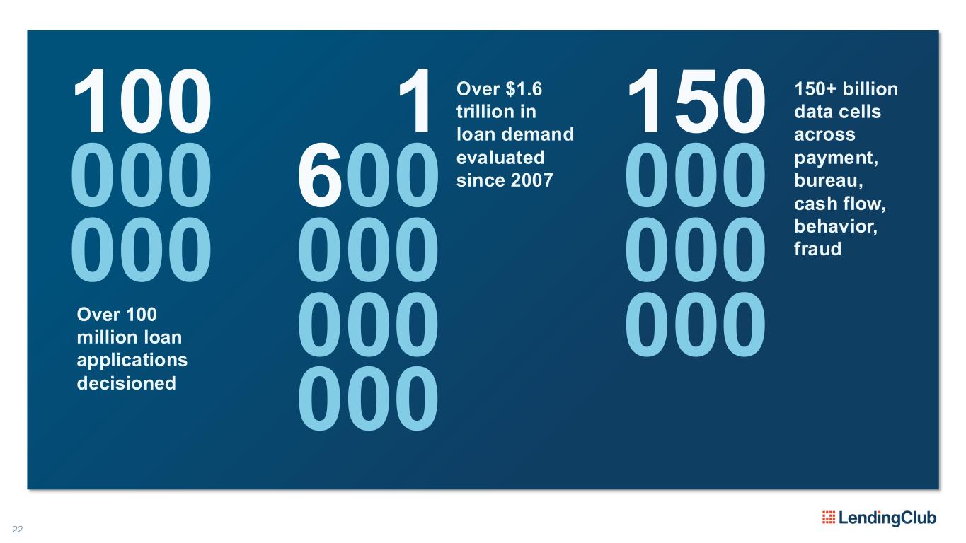 22 150 000 000 000 150+ billion data cells across payment, bureau, cash flow, behavior, fraud 1 600 000 000 000 100 000 000 Over 100 million loan applications decisioned Over $1.6 trillion in loan demand evaluated since 2007