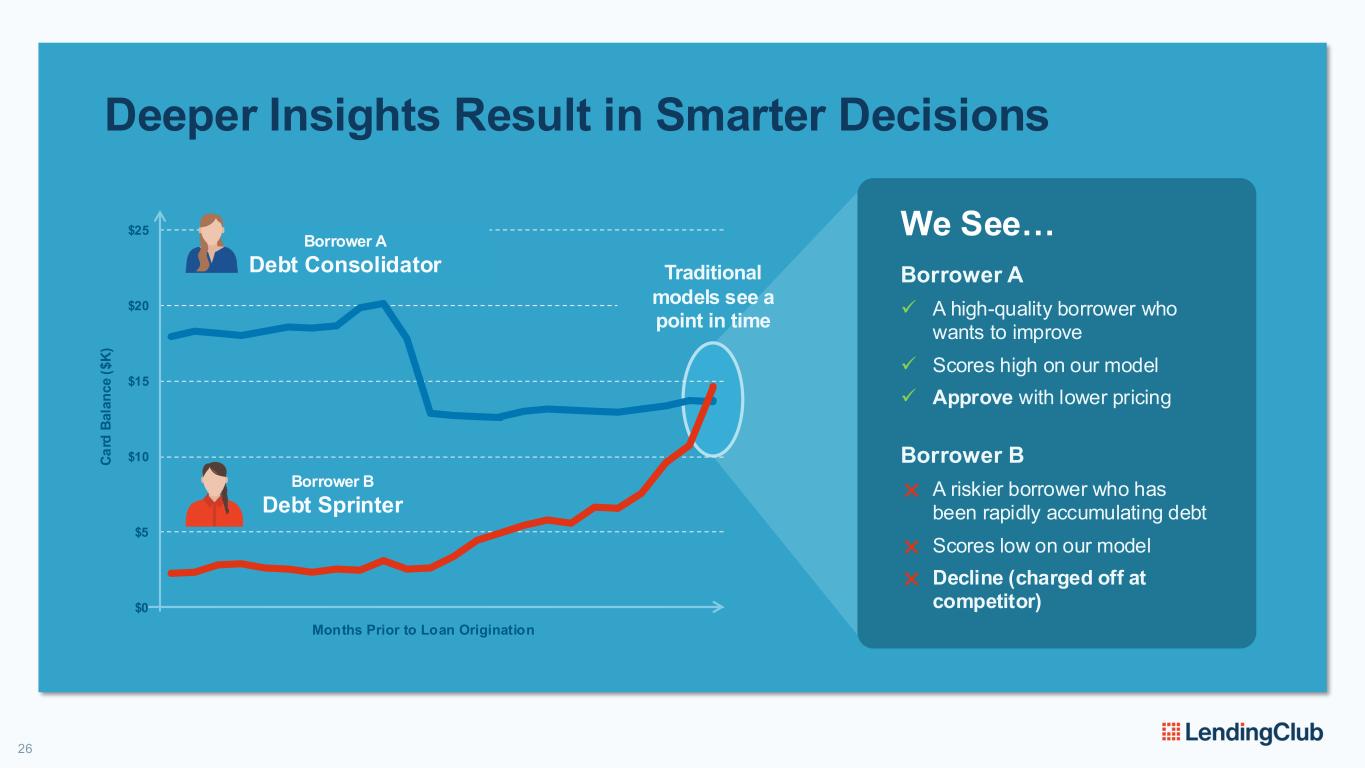 25 Traditional Models Don’t Capture the Full Picture Borrower A Borrower B FICO 719 718 Income $130K $130K DTI 22% 20% Card Balance $14K $15K