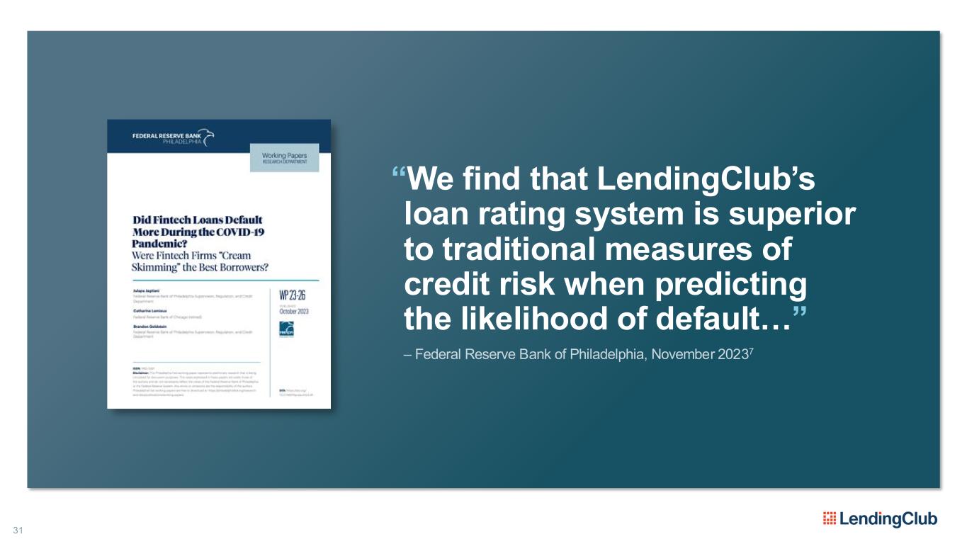 31 “We find that LendingClub’s loan rating system is superior to traditional measures of credit risk when predicting the likelihood of default…” – Federal Reserve Bank of Philadelphia, November 20237