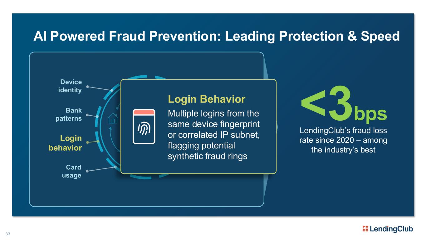 32 AI Powered Fraud Prevention: Leading Protection & Speed <3bps LendingClub’s fraud loss rate since 2020 – among the industry’s best Device identity Login behavior Bank patterns Geolocation Card usage Identity Email<1 sec