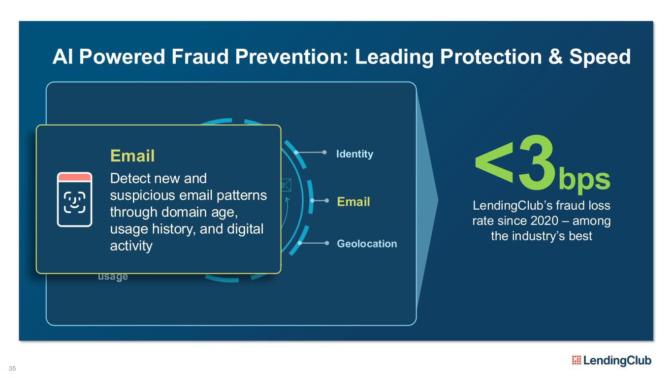 34 AI Powered Fraud Prevention: Leading Protection & Speed <3bps LendingClub’s fraud loss rate since 2020 – among the industry’s best Device identity Login behavior Bank patterns Geolocation Card usage Identity Email<1 sec Geolocation We detect a Texas home address but a login from Florida, triggering enhanced verification