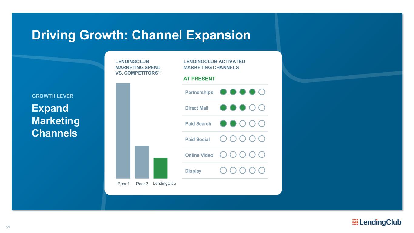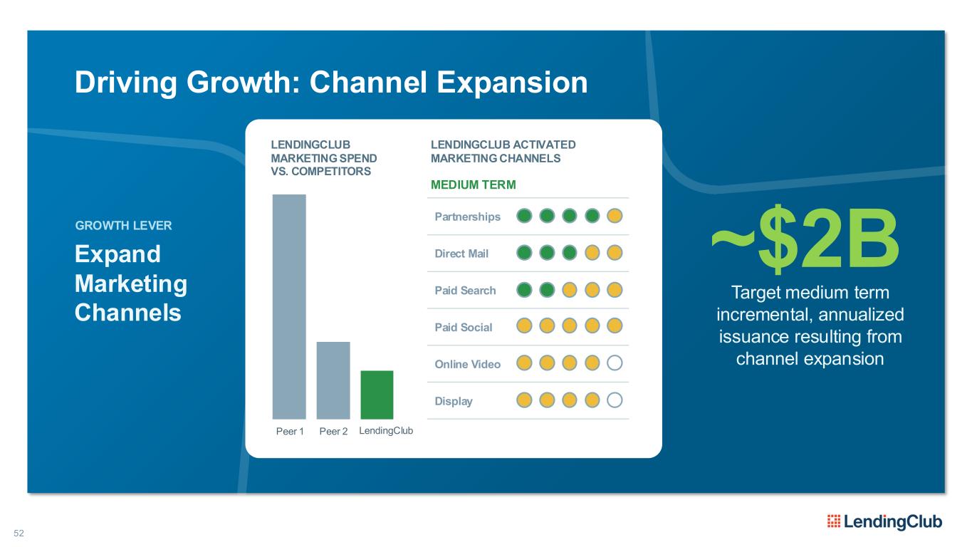 Partnerships Direct Mail Paid Search Paid Social Online Video Display 51 Driving Growth: Channel Expansion LENDINGCLUB MARKETING SPEND VS. COMPETITORS10 Peer 1 Peer 2 LendingClub LENDINGCLUB ACTIVATED MARKETING CHANNELS AT PRESENT Expand Marketing Channels GROWTH LEVER