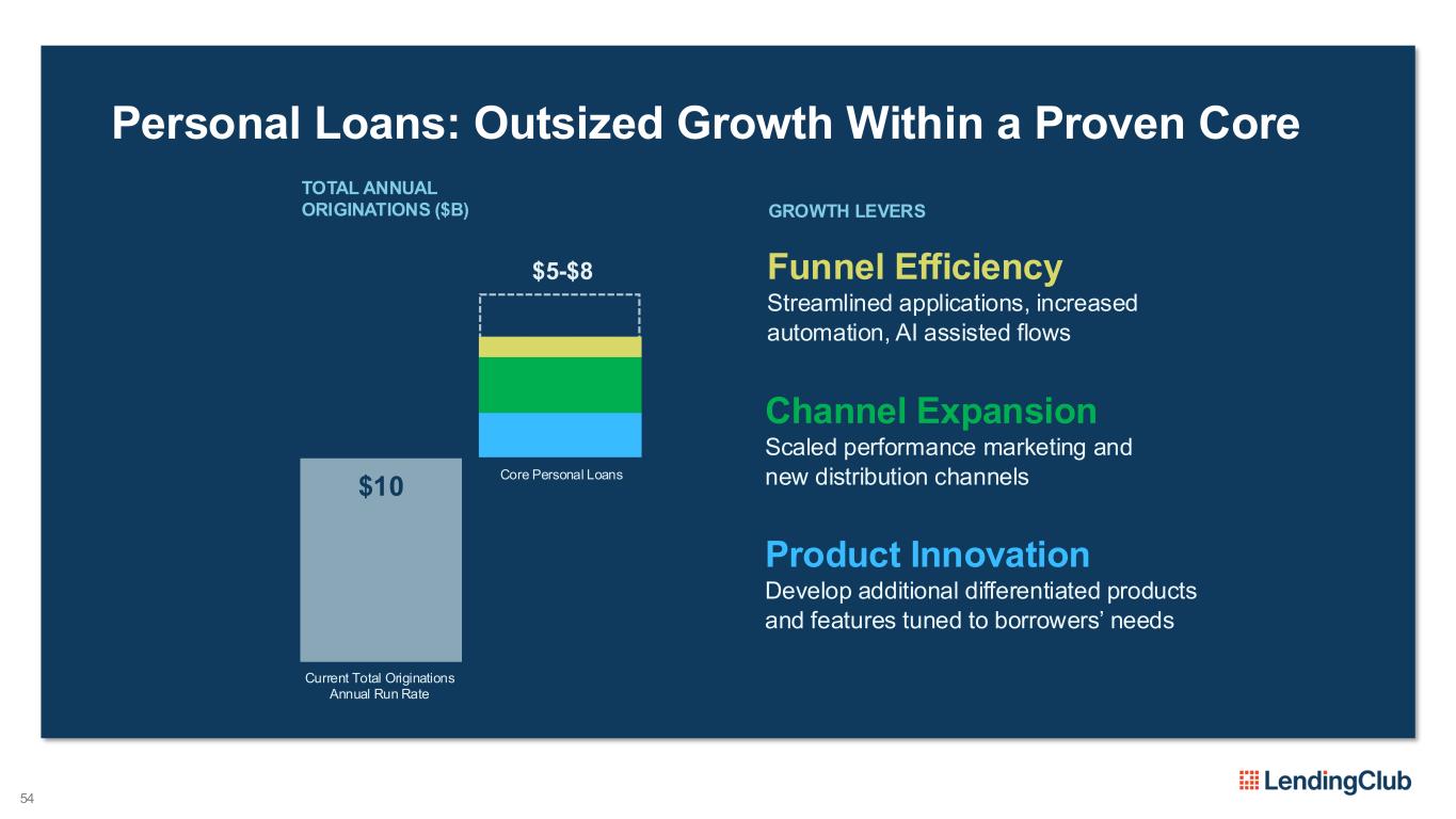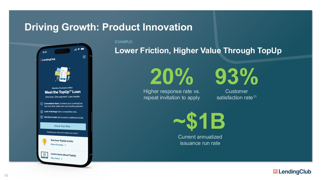 52 Driving Growth: Channel Expansion LENDINGCLUB MARKETING SPEND VS. COMPETITORS ~$2B Target medium term incremental, annualized issuance resulting from channel expansion Peer 1 Peer 2 LendingClub LENDINGCLUB ACTIVATED MARKETING CHANNELS MEDIUM TERM Expand Marketing Channels GROWTH LEVER Partnerships Direct Mail Paid Search Paid Social Online Video Display