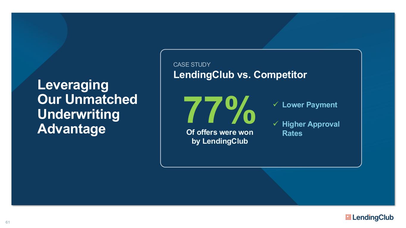 Leveraging Our Unmatched Underwriting Advantage 61 CASE STUDY LendingClub vs. Competitor 77% Of offers were won by LendingClub ✓ Lower Payment ✓ Higher Approval Rates