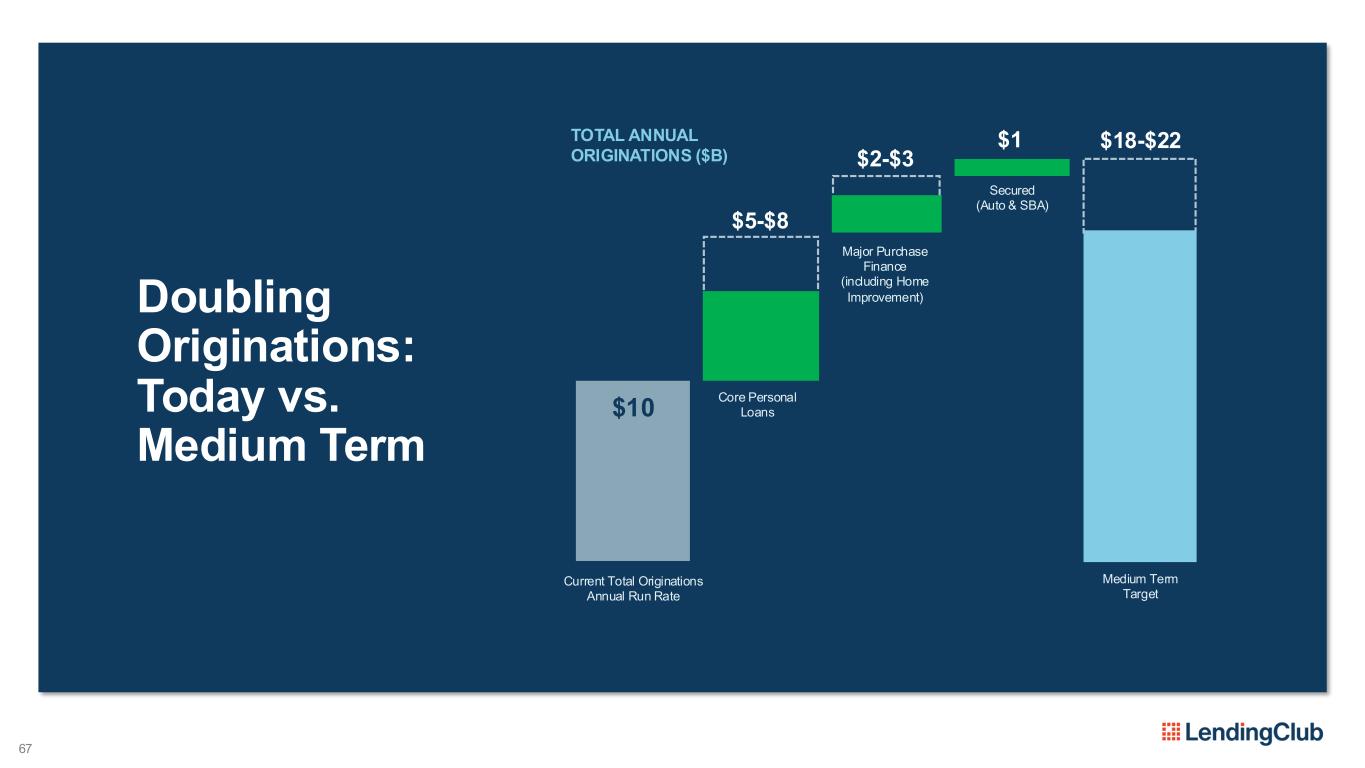 67 Doubling Originations: Today vs. Medium Term TOTAL ANNUAL ORIGINATIONS ($B) $10 Current Total Originations Annual Run Rate Core Personal Loans Secured (Auto & SBA) Major Purchase Finance (including Home Improvement) $5-$8 $1 $2-$3 Medium Term Target $18-$22
