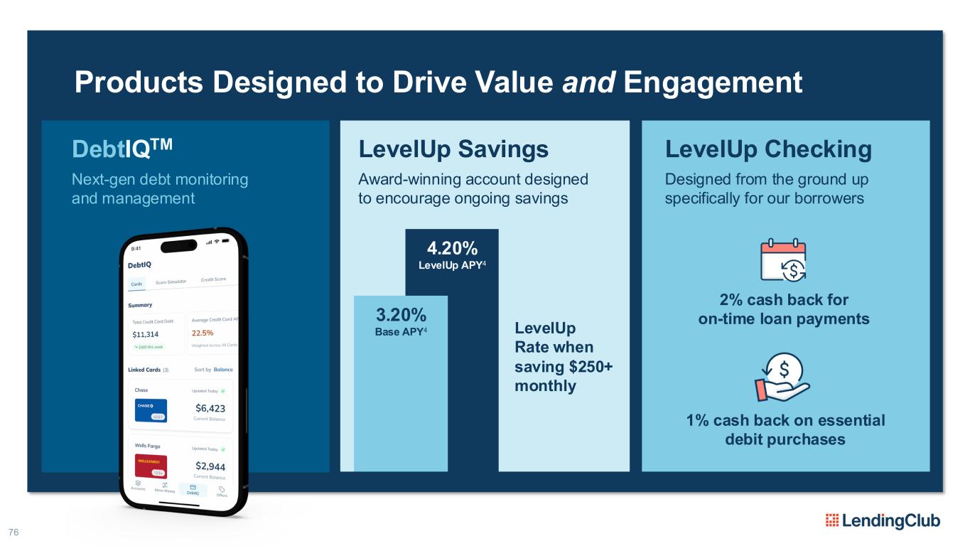 4.20% LevelUp APY4 76 Products Designed to Drive Value and Engagement LevelUp Savings Award-winning account designed to encourage ongoing savings LevelUp Checking Designed from the ground up specifically for our borrowers 3.20% Base APY4 LevelUp Rate when saving $250+ monthly 2% cash back for on-time loan payments 1% cash back on essential debit purchases DebtIQTM Next-gen debt monitoring and management