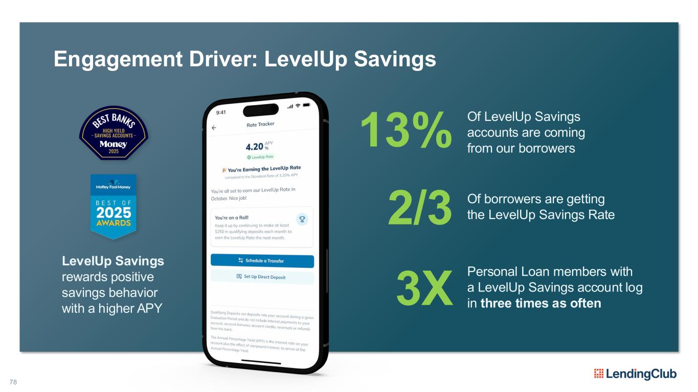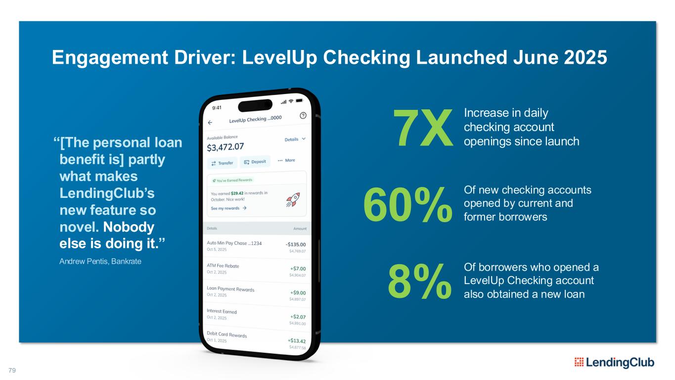 79 Engagement Driver: LevelUp Checking Launched June 2025 Increase in daily checking account openings since launch7X“[The personal loan benefit is] partly what makes LendingClub’s new feature so novel. Nobody else is doing it.” Andrew Pentis, Bankrate Of borrowers who opened a LevelUp Checking account also obtained a new loan8% Of new checking accounts opened by current and former borrowers60%