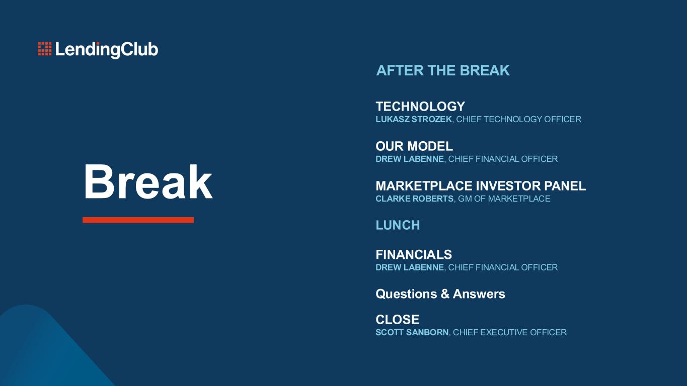 Break AFTER THE BREAK TECHNOLOGY LUKASZ STROZEK, CHIEF TECHNOLOGY OFFICER OUR MODEL DREW LABENNE, CHIEF FINANCIAL OFFICER MARKETPLACE INVESTOR PANEL CLARKE ROBERTS, GM OF MARKETPLACE LUNCH FINANCIALS DREW LABENNE, CHIEF FINANCIAL OFFICER Questions & Answers CLOSE SCOTT SANBORN, CHIEF EXECUTIVE OFFICER