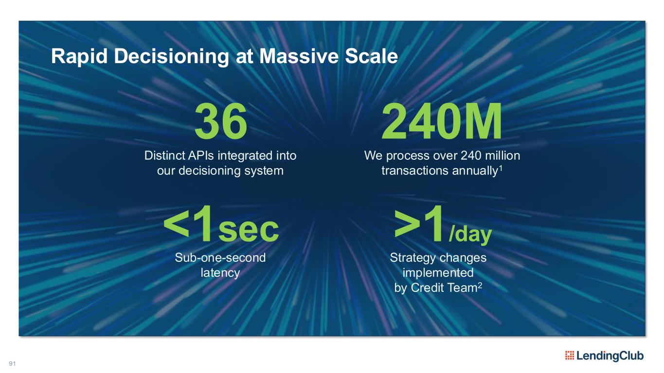 91 Rapid Decisioning at Massive Scale 240M We process over 240 million transactions annually1 <1sec Sub-one-second latency Distinct APIs integrated into our decisioning system >1/day Strategy changes implemented by Credit Team2 36