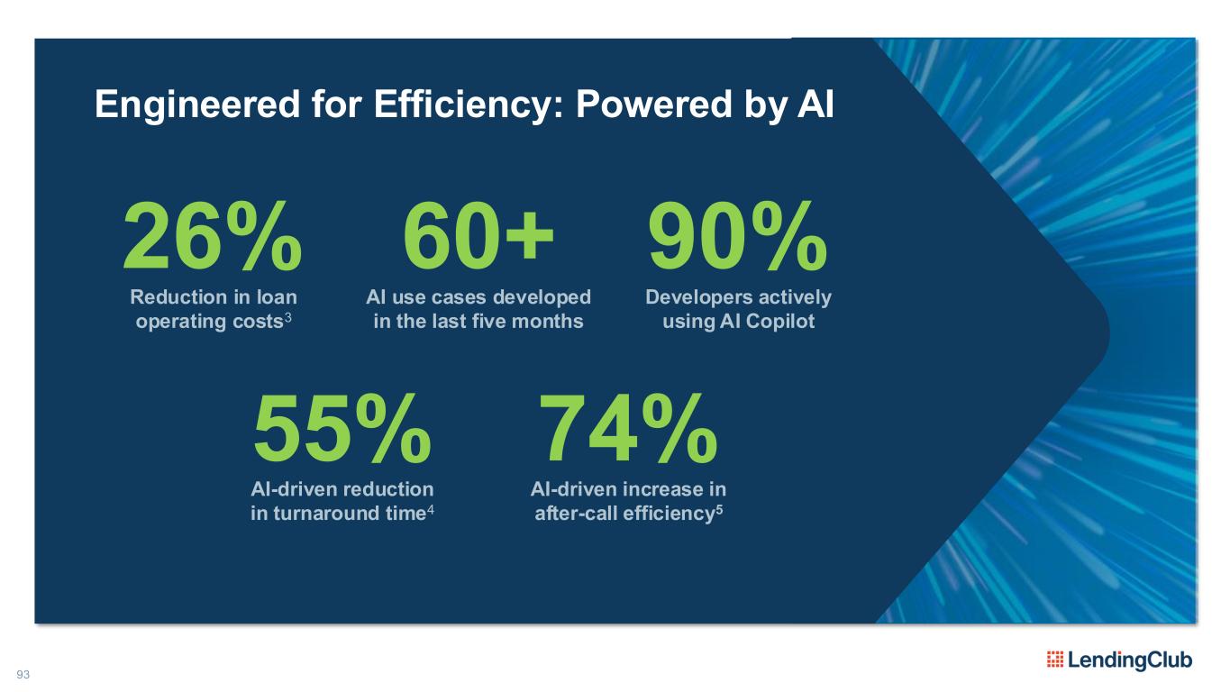 136 Footnotes Engineered for Innovation 1. Based on 2024 production data. 2. 630 credit changes made by the Credit Team over 2023 and 2024. 3. Based on estimated personal loans operations costs comparing Q3-23 to Q3-25. Operations costs reflect direct and indirect personnel related to loan origination, servicing, and collections. 4. 96% reduction in the time for document verification with AI-assisted document review. 5. Based on the 12-week average prior to deploying AI for automated after-call processing (May 14 – Aug. 6, 2025) compared to the most recent period post-AI implementation, Aug. 7 – Oct. 29, 2025. Best of Both Worlds: Digital Marketplace Bank 1. Average credit card annual percentage rate (APR) of 22.83% for accounts assessed interest as of August 2025. Source: Federal Reserve, G.19 Consumer Credit Report (https://www.federalreserve.gov/releases/g19/current/). 2. Average LendingClub Personal Loans APR and Net Asset Yield represents current internal estimates across 2024 and 2025 originations. Estimates are subject to change based on, among other things, portfolio performance and market conditions. 3. Benchmark rates as of 10/31/2025 for the following: Credit Cards (Fed Funds rate), LC Personal Loans (2-year treasury), HELOC (2-year treasury), Prime Auto Loans (3-year treasury), Prime Private Student Loans (5-year treasury), First Lien Mortgages (10-year treasury), Investment-Grade Securities (2-year treasury). 4. Net asset yield across different asset classes are based on LendingClub internal estimates. Estimates are subject to change based on, among other things, portfolio performance and market conditions. 5. Coupon, origination fee, acquisition and servicing costs, annualized net credit losses, and net asset yield represent LendingClub’s internal estimates for personal loan originations across 2024–2025. Estimates are subject to change based on, among other things, portfolio performance and market conditions. 6. This data is provided by dv01 to be used for informational purposes only. dv01 is not liable for use of this data. The data is the property and confidential information of dv01. Distribution outside of this presentation is prohibited. Delinquencies include 30+ day delinquencies for each respective quarterly vintage at month on book 9, including loans that are actively in hardship plans. Numbers quoted are an average of the most recent 3 quarterly vintages. There may be differences in the outperformance calculations due to rounding. 7. Balance sheet funding cost reflects funding primarily through interest-bearing deposits and partly through equity. 8. Net asset yield, balance sheet funding costs and value retained by LendingClub represent LendingClub internal estimates. Estimates are subject to change based on, among other things, portfolio performance and market conditions.
