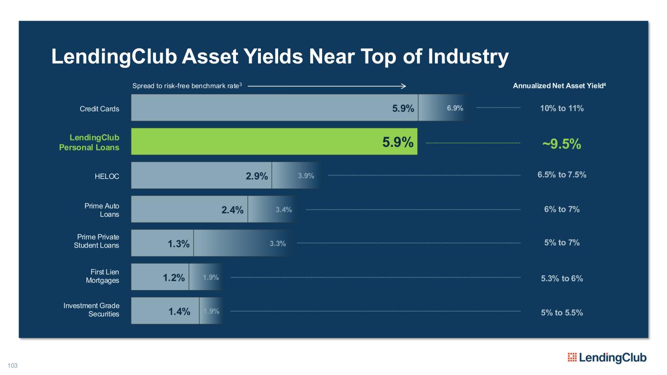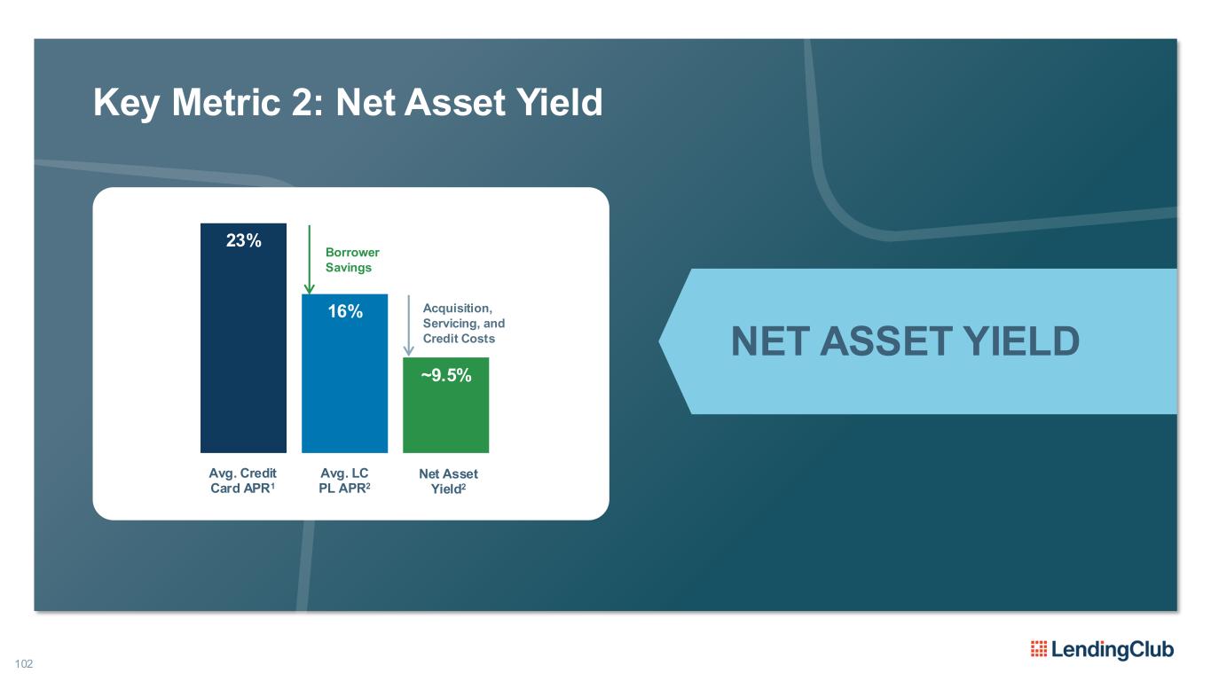 102 Key Metric 2: Net Asset Yield Avg. Credit Card APR1 Avg. LC PL APR2 Net Asset Yield2 Borrower Savings 23% 16% ~9.5% NET ASSET YIELD Acquisition, Servicing, and Credit Costs