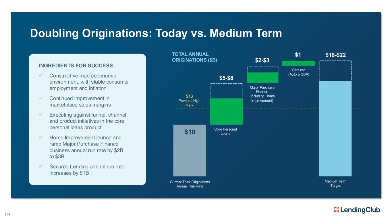 $13 Previous High Mark 114 Doubling Originations: Today vs. Medium Term INGREDIENTS FOR SUCCESS ✓ Constructive macroeconomic environment, with stable consumer employment and inflation ✓ Continued improvement in marketplace sales margins ✓ Executing against funnel, channel, and product initiatives in the core personal loans product ✓ Home Improvement launch and ramp Major Purchase Finance business annual run rate by $2B to $3B ✓ Secured Lending annual run rate increases by $1B TOTAL ANNUAL ORIGINATIONS ($B) $10 Current Total Originations Annual Run Rate Core Personal Loans Secured (Auto & SBA) Major Purchase Finance (including Home Improvement) $5-$8 $1 $2-$3 Medium Term Target $18-$22