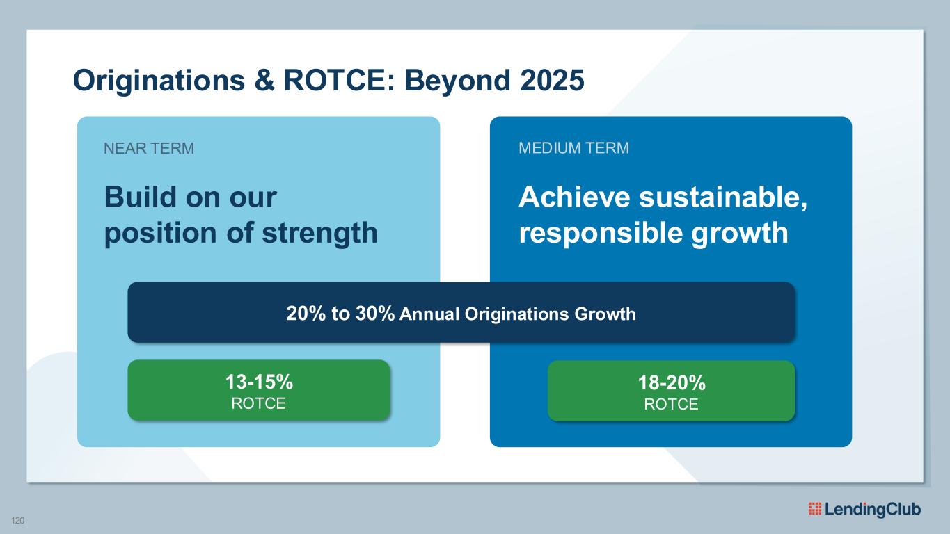 120 Originations & ROTCE: Beyond 2025 NEAR TERM MEDIUM TERM Build on our position of strength Achieve sustainable, responsible growth 13-15% ROTCE 18-20% ROTCE 20% to 30% Annual Originations Growth