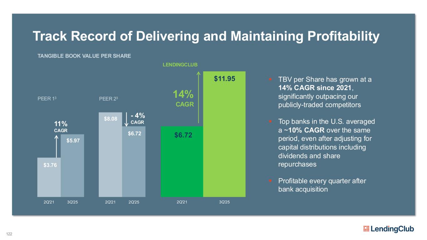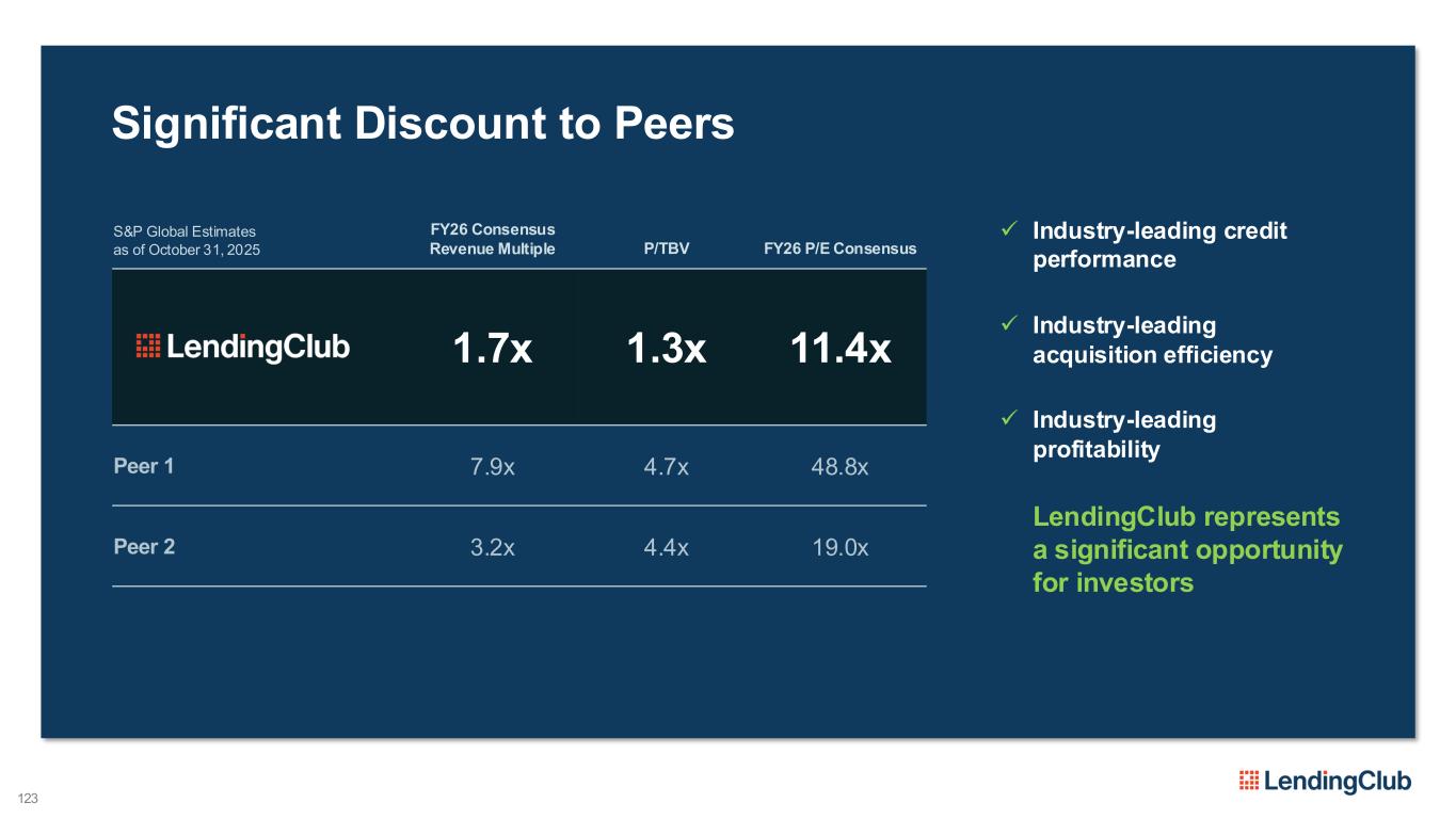 $8.08 $6.72 2Q'21 2Q'25 122 Track Record of Delivering and Maintaining Profitability ▪ TBV per Share has grown at a 14% CAGR since 2021, significantly outpacing our publicly-traded competitors ▪ Top banks in the U.S. averaged a ~10% CAGR over the same period, even after adjusting for capital distributions including dividends and share repurchases ▪ Profitable every quarter after bank acquisition TANGIBLE BOOK VALUE PER SHARE LENDINGCLUB $3.76 $5.97 2Q'21 3Q'25 PEER 13 11% CAGR PEER 23 - 4% CAGR $6.72 $11.95 2Q'21 3Q'25 14% CAGR