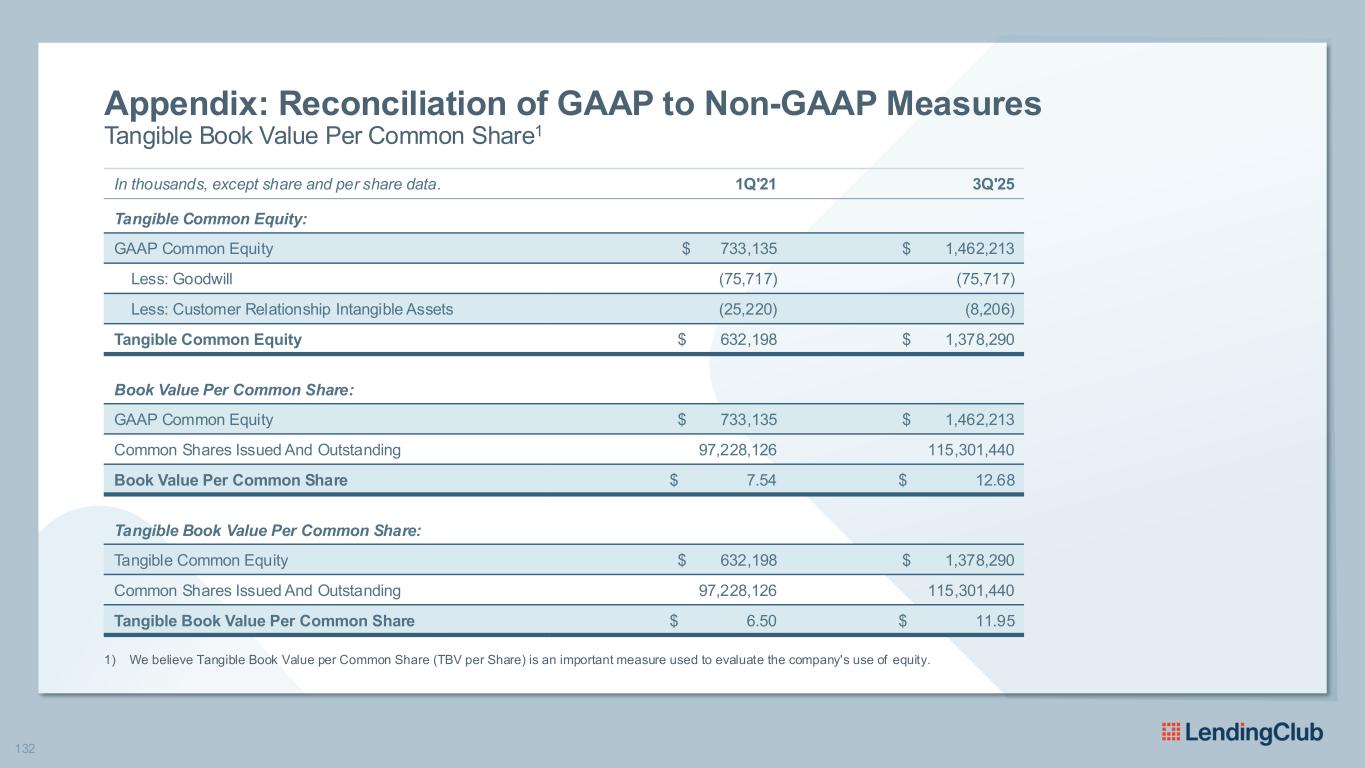 132 Appendix: Reconciliation of GAAP to Non-GAAP Measures Tangible Book Value Per Common Share1 1) We believe Tangible Book Value per Common Share (TBV per Share) is an important measure used to evaluate the company's use of equity. In thousands, except share and per share data. 1Q'21 3Q'25 Tangible Common Equity: GAAP Common Equity $ 733,135 $ 1,462,213 Less: Goodwill (75,717) (75,717) Less: Customer Relationship Intangible Assets (25,220) (8,206) Tangible Common Equity $ 632,198 $ 1,378,290 Book Value Per Common Share: GAAP Common Equity $ 733,135 $ 1,462,213 Common Shares Issued And Outstanding 97,228,126 115,301,440 Book Value Per Common Share $ 7.54 $ 12.68 Tangible Book Value Per Common Share: Tangible Common Equity $ 632,198 $ 1,378,290 Common Shares Issued And Outstanding 97,228,126 115,301,440 Tangible Book Value Per Common Share $ 6.50 $ 11.95