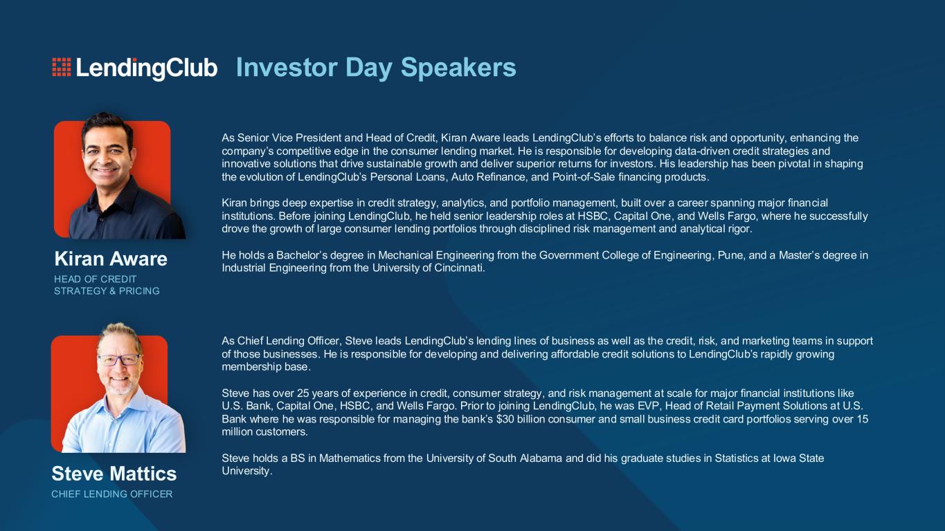 Investor Day Speakers As Senior Vice President and Head of Credit, Kiran Aware leads LendingClub’s efforts to balance risk and opportunity, enhancing the company’s competitive edge in the consumer lending market. He is responsible for developing data-driven credit strategies and innovative solutions that drive sustainable growth and deliver superior returns for investors. His leadership has been pivotal in shaping the evolution of LendingClub’s Personal Loans, Auto Refinance, and Point-of-Sale financing products. Kiran brings deep expertise in credit strategy, analytics, and portfolio management, built over a career spanning major financial institutions. Before joining LendingClub, he held senior leadership roles at HSBC, Capital One, and Wells Fargo, where he successfully drove the growth of large consumer lending portfolios through disciplined risk management and analytical rigor. He holds a Bachelor’s degree in Mechanical Engineering from the Government College of Engineering, Pune, and a Master’s degree in Industrial Engineering from the University of Cincinnati. Kiran Aware HEAD OF CREDIT STRATEGY & PRICING As Chief Lending Officer, Steve leads LendingClub’s lending lines of business as well as the credit, risk, and marketing teams in support of those businesses. He is responsible for developing and delivering affordable credit solutions to LendingClub’s rapidly growing membership base. Steve has over 25 years of experience in credit, consumer strategy, and risk management at scale for major financial institutions like U.S. Bank, Capital One, HSBC, and Wells Fargo. Prior to joining LendingClub, he was EVP, Head of Retail Payment Solutions at U.S. Bank where he was responsible for managing the bank’s $30 billion consumer and small business credit card portfolios serving over 15 million customers. Steve holds a BS in Mathematics from the University of South Alabama and did his graduate studies in Statistics at Iowa State University.Steve Mattics CHIEF LENDING OFFICER