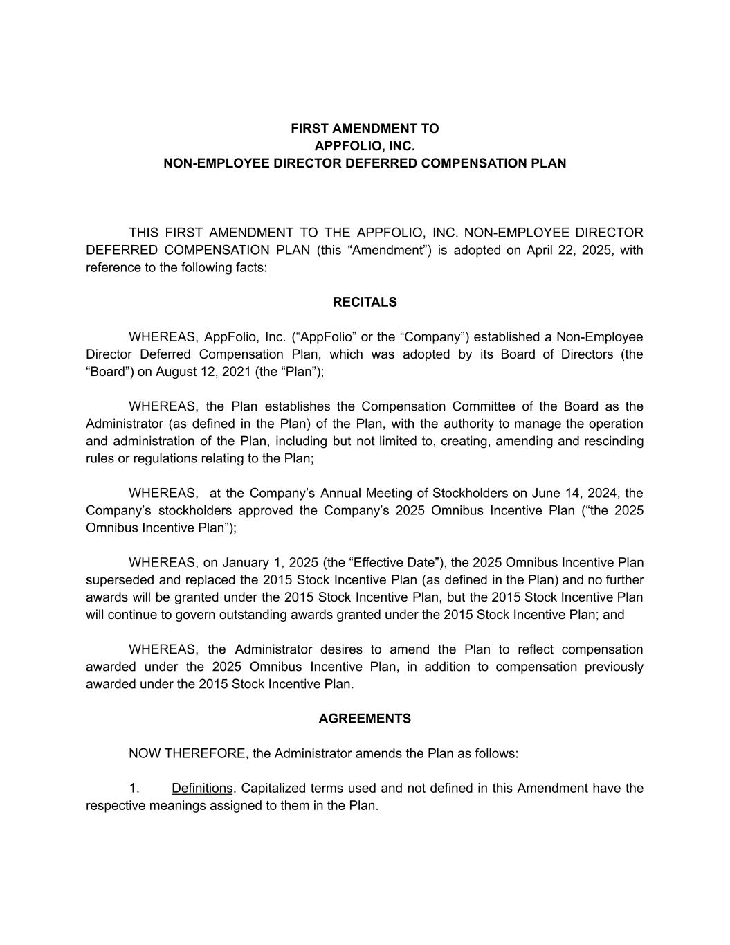 FIRST AMENDMENT TO APPFOLIO, INC. NON-EMPLOYEE DIRECTOR DEFERRED COMPENSATION PLAN THIS FIRST AMENDMENT TO THE APPFOLIO, INC. NON-EMPLOYEE DIRECTOR DEFERRED COMPENSATION PLAN (this “Amendment”) is adopted on April 22, 2025, with reference to the following facts: RECITALS WHEREAS, AppFolio, Inc. (“AppFolio” or the “Company”) established a Non-Employee Director Deferred Compensation Plan, which was adopted by its Board of Directors (the “Board”) on August 12, 2021 (the “Plan”); WHEREAS, the Plan establishes the Compensation Committee of the Board as the Administrator (as defined in the Plan) of the Plan, with the authority to manage the operation and administration of the Plan, including but not limited to, creating, amending and rescinding rules or regulations relating to the Plan; WHEREAS, at the Company’s Annual Meeting of Stockholders on June 14, 2024, the Company’s stockholders approved the Company’s 2025 Omnibus Incentive Plan (“the 2025 Omnibus Incentive Plan”); WHEREAS, on January 1, 2025 (the “Effective Date”), the 2025 Omnibus Incentive Plan superseded and replaced the 2015 Stock Incentive Plan (as defined in the Plan) and no further awards will be granted under the 2015 Stock Incentive Plan, but the 2015 Stock Incentive Plan will continue to govern outstanding awards granted under the 2015 Stock Incentive Plan; and WHEREAS, the Administrator desires to amend the Plan to reflect compensation awarded under the 2025 Omnibus Incentive Plan, in addition to compensation previously awarded under the 2015 Stock Incentive Plan. AGREEMENTS NOW THEREFORE, the Administrator amends the Plan as follows: 1. Definitions . Capitalized terms used and not defined in this Amendment have the respective meanings assigned to them in the Plan.