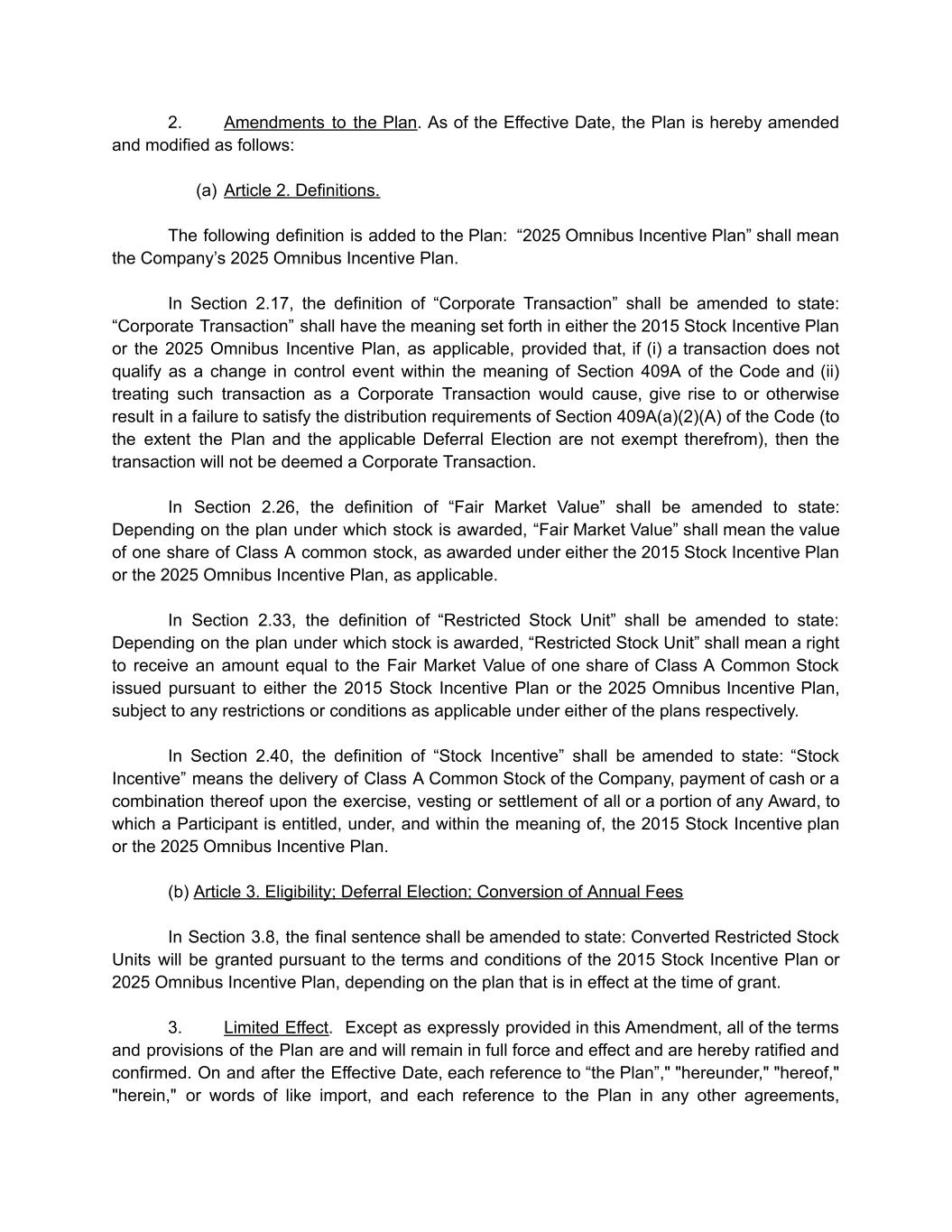 2. Amendments to the Plan . As of the Effective Date, the Plan is hereby amended and modified as follows: (a) Article 2. Definitions. The following definition is added to the Plan: “2025 Omnibus Incentive Plan” shall mean the Company’s 2025 Omnibus Incentive Plan. In Section 2.17, the definition of “Corporate Transaction” shall be amended to state: “Corporate Transaction” shall have the meaning set forth in either the 2015 Stock Incentive Plan or the 2025 Omnibus Incentive Plan, as applicable, provided that, if (i) a transaction does not qualify as a change in control event within the meaning of Section 409A of the Code and (ii) treating such transaction as a Corporate Transaction would cause, give rise to or otherwise result in a failure to satisfy the distribution requirements of Section 409A(a)(2)(A) of the Code (to the extent the Plan and the applicable Deferral Election are not exempt therefrom), then the transaction will not be deemed a Corporate Transaction. In Section 2.26, the definition of “Fair Market Value” shall be amended to state: Depending on the plan under which stock is awarded, “Fair Market Value” shall mean the value of one share of Class A common stock, as awarded under either the 2015 Stock Incentive Plan or the 2025 Omnibus Incentive Plan, as applicable. In Section 2.33, the definition of “Restricted Stock Unit” shall be amended to state: Depending on the plan under which stock is awarded, “Restricted Stock Unit” shall mean a right to receive an amount equal to the Fair Market Value of one share of Class A Common Stock issued pursuant to either the 2015 Stock Incentive Plan or the 2025 Omnibus Incentive Plan, subject to any restrictions or conditions as applicable under either of the plans respectively. In Section 2.40, the definition of “Stock Incentive” shall be amended to state: “Stock Incentive” means the delivery of Class A Common Stock of the Company, payment of cash or a combination thereof upon the exercise, vesting or settlement of all or a portion of any Award, to which a Participant is entitled, under, and within the meaning of, the 2015 Stock Incentive plan or the 2025 Omnibus Incentive Plan. (b) Article 3. Eligibility; Deferral Election; Conversion of Annual Fees In Section 3.8, the final sentence shall be amended to state: Converted Restricted Stock Units will be granted pursuant to the terms and conditions of the 2015 Stock Incentive Plan or 2025 Omnibus Incentive Plan, depending on the plan that is in effect at the time of grant. 3. Limited Effect . Except as expressly provided in this Amendment, all of the terms and provisions of the Plan are and will remain in full force and effect and are hereby ratified and confirmed. On and after the Effective Date, each reference to “the Plan”," "hereunder," "hereof," "herein," or words of like import, and each reference to the Plan in any other agreements,
