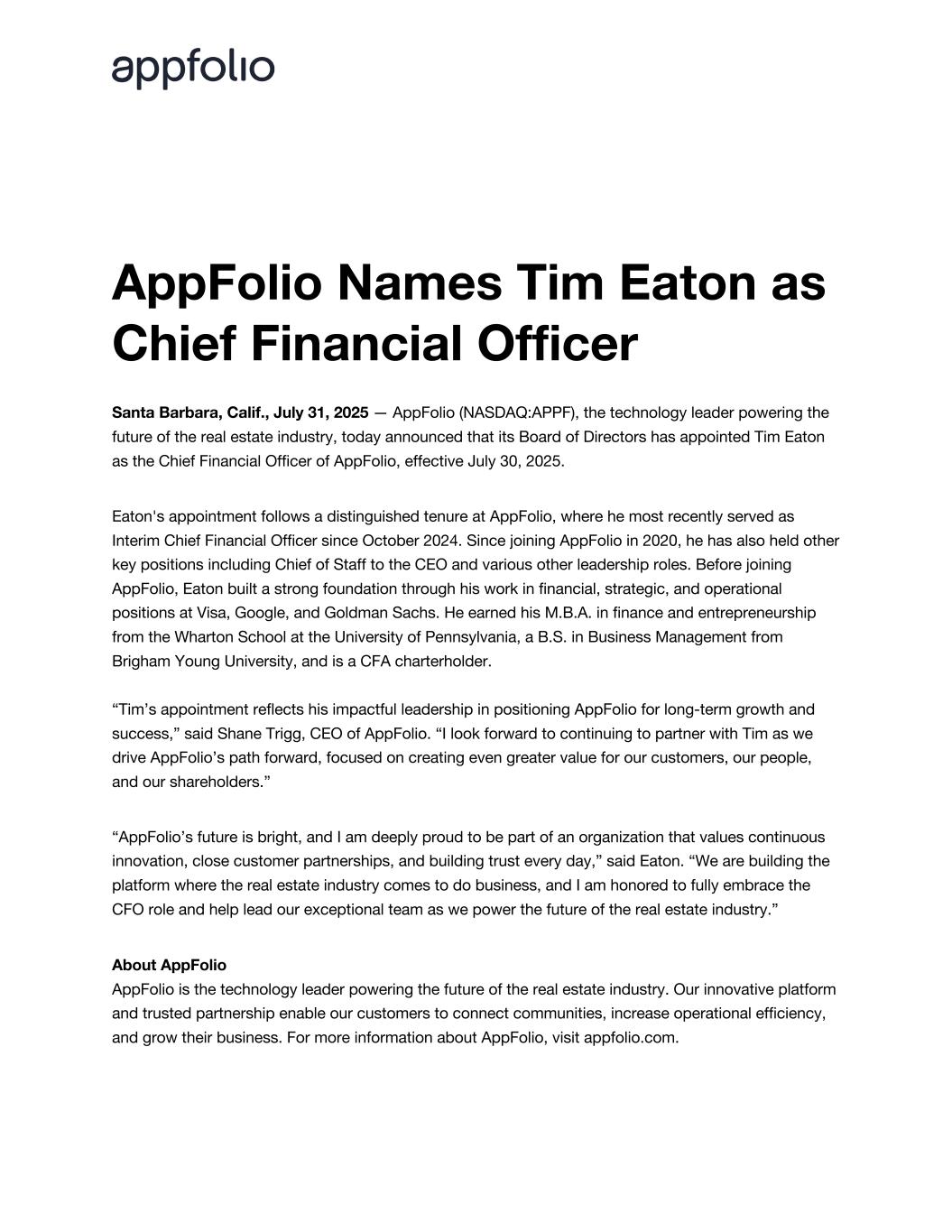 As previously announced, the Company will host a conference call today, July 31, 2025, at 2:00 p.m. Pacific Time (PT), 5:00 p.m. Eastern Time (ET), to discuss the Company’s second quarter financial results. A live webcast of the call will be available at: https://edge.media-server.com/mmc/p/ijgr58yt. To access the call by phone, please go to the following link: https://register-conf.media-server.com/register/BIdccd543a8ef7485c8f06cd2837c68ea9, and you will be provided with dial in details. A replay of the webcast will also be available for a limited time on AppFolio’s Investor Relations website at https://ir.appfolioinc.com/news-events/events.