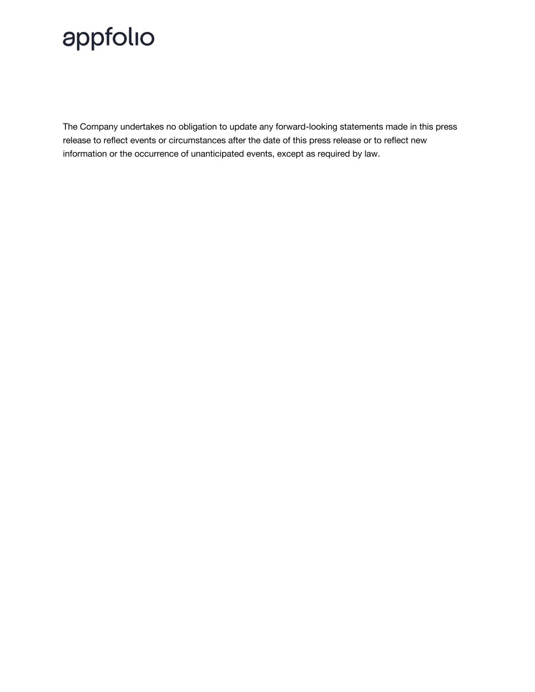 Reconciliations of current and historical non-GAAP financial measures to AppFolio’s financial results as determined in accordance with GAAP are included at the end of this press release following the accompanying financial data. For a description of these non-GAAP financial measures, including the reasons management uses each measure, please see the section of the tables entitled “Statement Regarding the Use of Non-GAAP Financial Measures.”