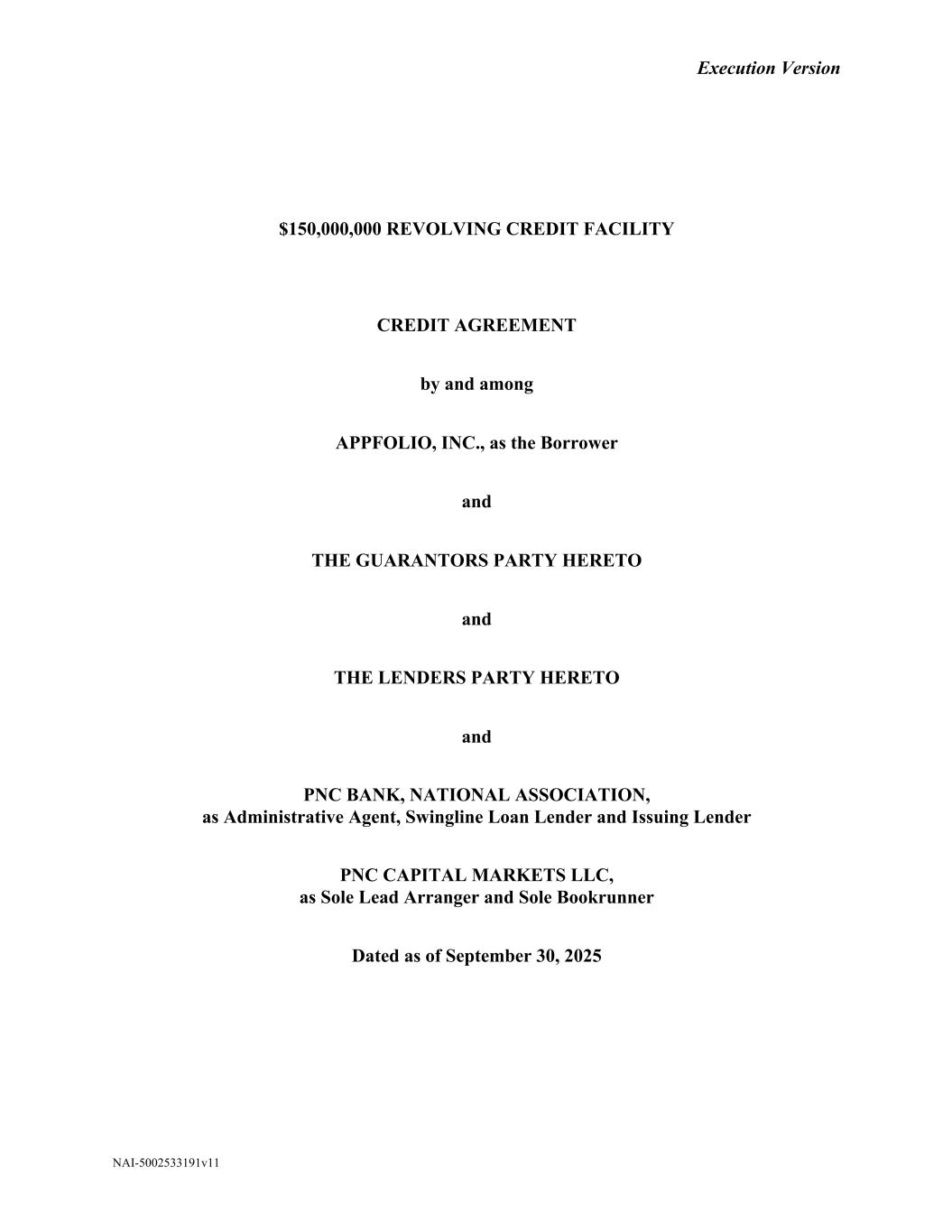 NAI-5002533191v11 Execution Version $150,000,000 REVOLVING CREDIT FACILITY CREDIT AGREEMENT by and among APPFOLIO, INC., as the Borrower and THE GUARANTORS PARTY HERETO and THE LENDERS PARTY HERETO and PNC BANK, NATIONAL ASSOCIATION, as Administrative Agent, Swingline Loan Lender and Issuing Lender PNC CAPITAL MARKETS LLC, as Sole Lead Arranger and Sole Bookrunner Dated as of September 30, 2025