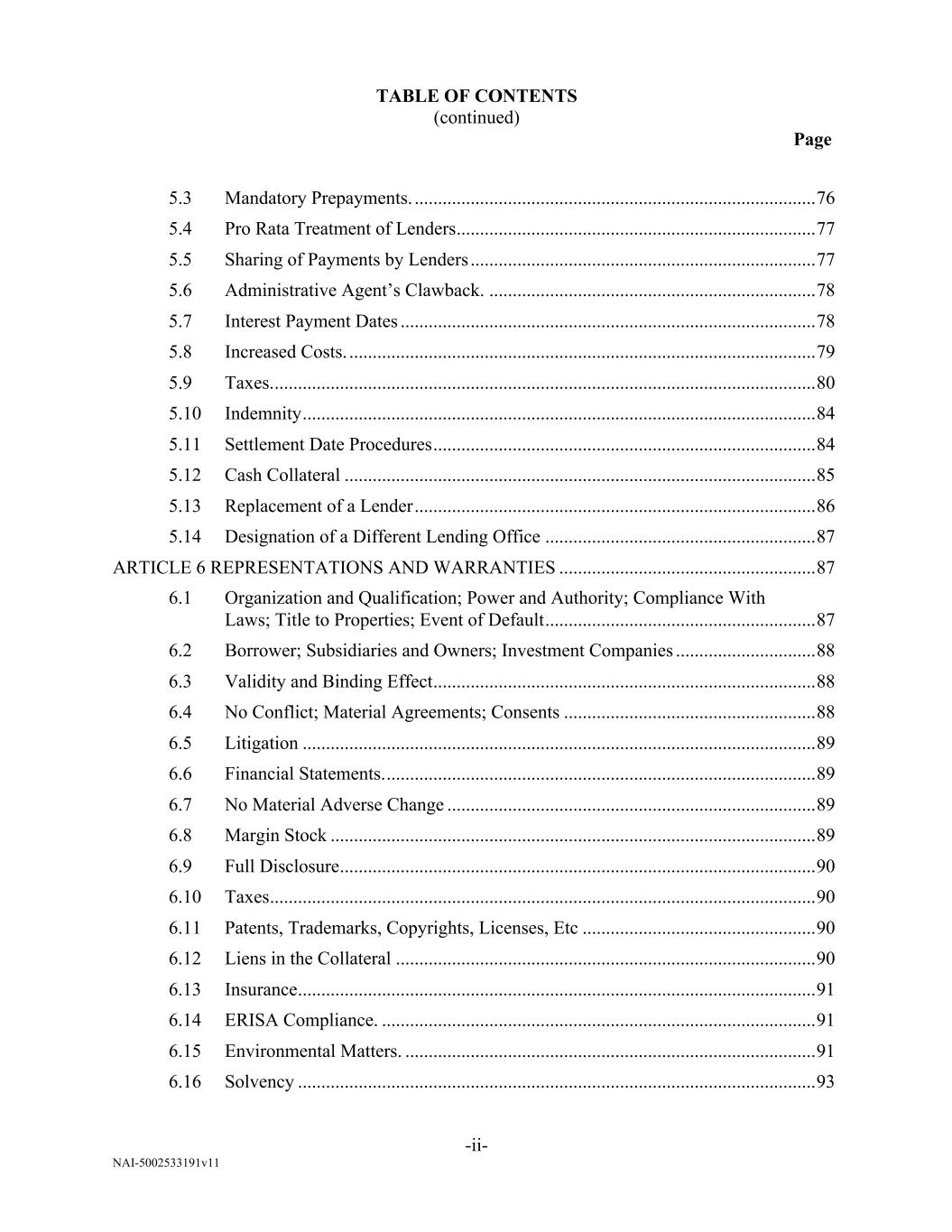 NAI-5002533191v11 TABLE OF CONTENTS (continued) Page -ii- 5.3 Mandatory Prepayments. ...................................................................................... 76 5.4 Pro Rata Treatment of Lenders ............................................................................. 77 5.5 Sharing of Payments by Lenders .......................................................................... 77 5.6 Administrative Agent’s Clawback. ...................................................................... 78 5.7 Interest Payment Dates ......................................................................................... 78 5.8 Increased Costs. .................................................................................................... 79 5.9 Taxes. .................................................................................................................... 80 5.10 Indemnity .............................................................................................................. 84 5.11 Settlement Date Procedures .................................................................................. 84 5.12 Cash Collateral ..................................................................................................... 85 5.13 Replacement of a Lender ...................................................................................... 86 5.14 Designation of a Different Lending Office .......................................................... 87 ARTICLE 6 REPRESENTATIONS AND WARRANTIES ....................................................... 87 6.1 Organization and Qualification; Power and Authority; Compliance With Laws; Title to Properties; Event of Default .......................................................... 87 6.2 Borrower; Subsidiaries and Owners; Investment Companies .............................. 88 6.3 Validity and Binding Effect .................................................................................. 88 6.4 No Conflict; Material Agreements; Consents ...................................................... 88 6.5 Litigation .............................................................................................................. 89 6.6 Financial Statements. ............................................................................................ 89 6.7 No Material Adverse Change ............................................................................... 89 6.8 Margin Stock ........................................................................................................ 89 6.9 Full Disclosure ...................................................................................................... 90 6.10 Taxes ..................................................................................................................... 90 6.11 Patents, Trademarks, Copyrights, Licenses, Etc .................................................. 90 6.12 Liens in the Collateral .......................................................................................... 90 6.13 Insurance ............................................................................................................... 91 6.14 ERISA Compliance. ............................................................................................. 91 6.15 Environmental Matters. ........................................................................................ 91 6.16 Solvency ............................................................................................................... 93