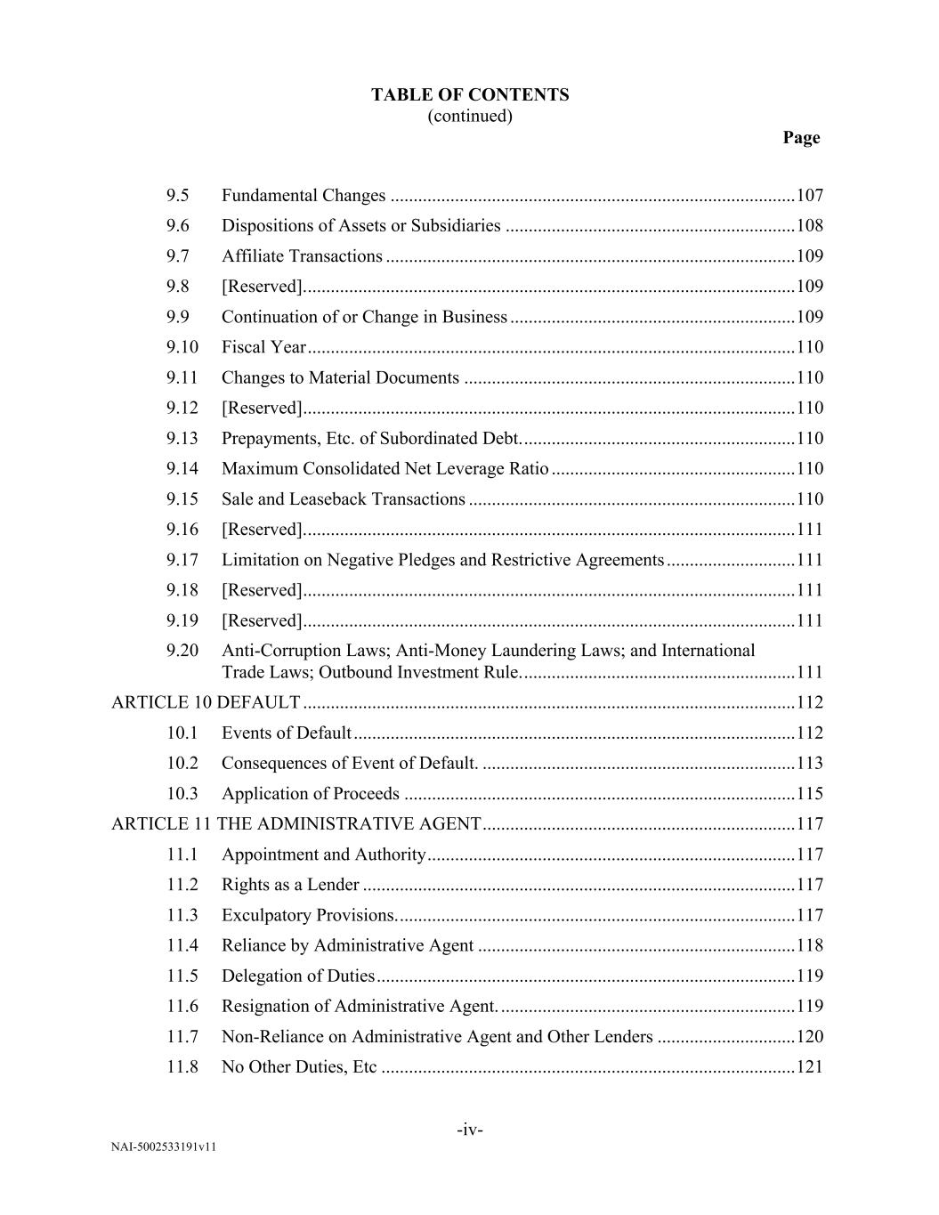 NAI-5002533191v11 TABLE OF CONTENTS (continued) Page -iv- 9.5 Fundamental Changes ........................................................................................ 107 9.6 Dispositions of Assets or Subsidiaries ............................................................... 108 9.7 Affiliate Transactions ......................................................................................... 109 9.8 [Reserved]. .......................................................................................................... 109 9.9 Continuation of or Change in Business .............................................................. 109 9.10 Fiscal Year .......................................................................................................... 110 9.11 Changes to Material Documents ........................................................................ 110 9.12 [Reserved] ........................................................................................................... 110 9.13 Prepayments, Etc. of Subordinated Debt. ........................................................... 110 9.14 Maximum Consolidated Net Leverage Ratio ..................................................... 110 9.15 Sale and Leaseback Transactions ....................................................................... 110 9.16 [Reserved]. .......................................................................................................... 111 9.17 Limitation on Negative Pledges and Restrictive Agreements ............................ 111 9.18 [Reserved] ........................................................................................................... 111 9.19 [Reserved] ........................................................................................................... 111 9.20 Anti-Corruption Laws; Anti-Money Laundering Laws; and International Trade Laws; Outbound Investment Rule. ........................................................... 111 ARTICLE 10 DEFAULT ........................................................................................................... 112 10.1 Events of Default ................................................................................................ 112 10.2 Consequences of Event of Default. .................................................................... 113 10.3 Application of Proceeds ..................................................................................... 115 ARTICLE 11 THE ADMINISTRATIVE AGENT .................................................................... 117 11.1 Appointment and Authority ................................................................................ 117 11.2 Rights as a Lender .............................................................................................. 117 11.3 Exculpatory Provisions. ...................................................................................... 117 11.4 Reliance by Administrative Agent ..................................................................... 118 11.5 Delegation of Duties ........................................................................................... 119 11.6 Resignation of Administrative Agent. ................................................................ 119 11.7 Non-Reliance on Administrative Agent and Other Lenders .............................. 120 11.8 No Other Duties, Etc .......................................................................................... 121