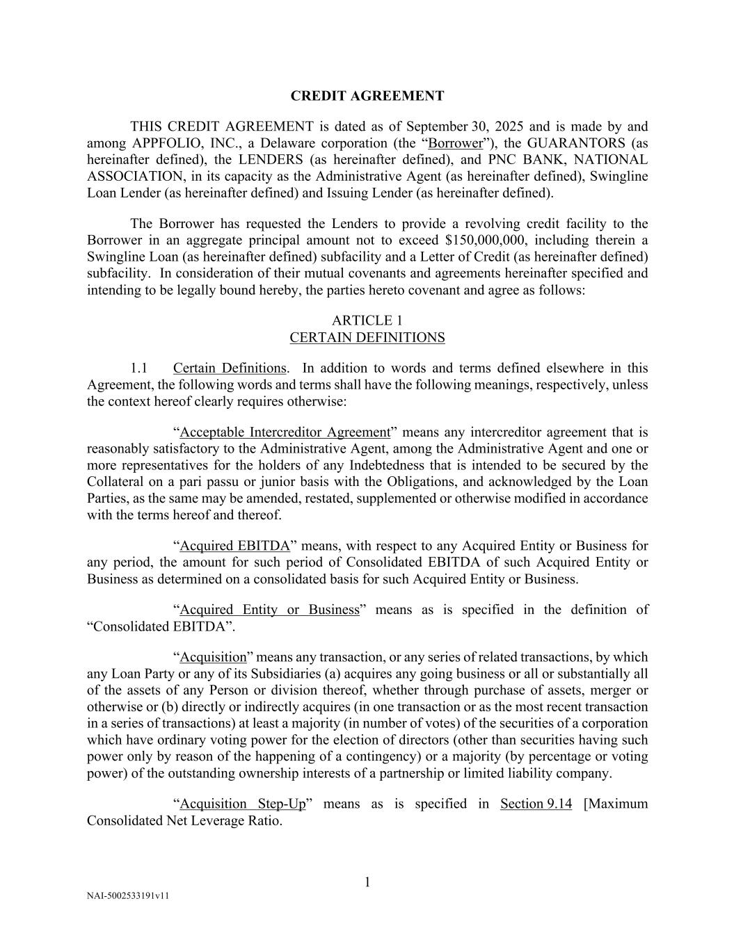 NAI-5002533191v11 1 CREDIT AGREEMENT THIS CREDIT AGREEMENT is dated as of September 30, 2025 and is made by and among APPFOLIO, INC., a Delaware corporation (the “Borrower”), the GUARANTORS (as hereinafter defined), the LENDERS (as hereinafter defined), and PNC BANK, NATIONAL ASSOCIATION, in its capacity as the Administrative Agent (as hereinafter defined), Swingline Loan Lender (as hereinafter defined) and Issuing Lender (as hereinafter defined). The Borrower has requested the Lenders to provide a revolving credit facility to the Borrower in an aggregate principal amount not to exceed $150,000,000, including therein a Swingline Loan (as hereinafter defined) subfacility and a Letter of Credit (as hereinafter defined) subfacility. In consideration of their mutual covenants and agreements hereinafter specified and intending to be legally bound hereby, the parties hereto covenant and agree as follows: ARTICLE 1 CERTAIN DEFINITIONS 1.1 Certain Definitions. In addition to words and terms defined elsewhere in this Agreement, the following words and terms shall have the following meanings, respectively, unless the context hereof clearly requires otherwise: “Acceptable Intercreditor Agreement” means any intercreditor agreement that is reasonably satisfactory to the Administrative Agent, among the Administrative Agent and one or more representatives for the holders of any Indebtedness that is intended to be secured by the Collateral on a pari passu or junior basis with the Obligations, and acknowledged by the Loan Parties, as the same may be amended, restated, supplemented or otherwise modified in accordance with the terms hereof and thereof. “Acquired EBITDA” means, with respect to any Acquired Entity or Business for any period, the amount for such period of Consolidated EBITDA of such Acquired Entity or Business as determined on a consolidated basis for such Acquired Entity or Business. “Acquired Entity or Business” means as is specified in the definition of “Consolidated EBITDA”. “Acquisition” means any transaction, or any series of related transactions, by which any Loan Party or any of its Subsidiaries (a) acquires any going business or all or substantially all of the assets of any Person or division thereof, whether through purchase of assets, merger or otherwise or (b) directly or indirectly acquires (in one transaction or as the most recent transaction in a series of transactions) at least a majority (in number of votes) of the securities of a corporation which have ordinary voting power for the election of directors (other than securities having such power only by reason of the happening of a contingency) or a majority (by percentage or voting power) of the outstanding ownership interests of a partnership or limited liability company. “Acquisition Step-Up” means as is specified in Section 9.14 [Maximum Consolidated Net Leverage Ratio.