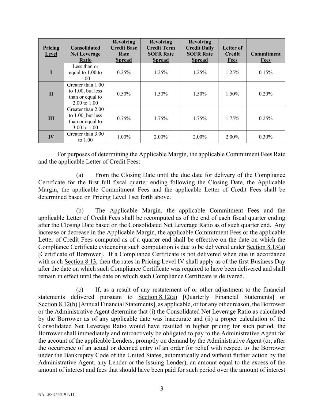NAI-5002533191v11 3 Pricing Level Consolidated Net Leverage Ratio Revolving Credit Base Rate Spread Revolving Credit Term SOFR Rate Spread Revolving Credit Daily SOFR Rate Spread Letter of Credit Fees Commitment Fees I Less than or equal to 1.00 to 1.00 0.25% 1.25% 1.25% 1.25% 0.15% II Greater than 1.00 to 1.00, but less than or equal to 2.00 to 1.00 0.50% 1.50% 1.50% 1.50% 0.20% III Greater than 2.00 to 1.00, but less than or equal to 3.00 to 1.00 0.75% 1.75% 1.75% 1.75% 0.25% IV Greater than 3.00 to 1.00 1.00% 2.00% 2.00% 2.00% 0.30% For purposes of determining the Applicable Margin, the applicable Commitment Fees Rate and the applicable Letter of Credit Fees: (a) From the Closing Date until the due date for delivery of the Compliance Certificate for the first full fiscal quarter ending following the Closing Date, the Applicable Margin, the applicable Commitment Fees and the applicable Letter of Credit Fees shall be determined based on Pricing Level I set forth above. (b) The Applicable Margin, the applicable Commitment Fees and the applicable Letter of Credit Fees shall be recomputed as of the end of each fiscal quarter ending after the Closing Date based on the Consolidated Net Leverage Ratio as of such quarter end. Any increase or decrease in the Applicable Margin, the applicable Commitment Fees or the applicable Letter of Credit Fees computed as of a quarter end shall be effective on the date on which the Compliance Certificate evidencing such computation is due to be delivered under Section 8.13(a) [Certificate of Borrower]. If a Compliance Certificate is not delivered when due in accordance with such Section 8.13, then the rates in Pricing Level IV shall apply as of the first Business Day after the date on which such Compliance Certificate was required to have been delivered and shall remain in effect until the date on which such Compliance Certificate is delivered. (c) If, as a result of any restatement of or other adjustment to the financial statements delivered pursuant to Section 8.12(a) [Quarterly Financial Statements] or Section 8.12(b) [Annual Financial Statements], as applicable, or for any other reason, the Borrower or the Administrative Agent determine that (i) the Consolidated Net Leverage Ratio as calculated by the Borrower as of any applicable date was inaccurate and (ii) a proper calculation of the Consolidated Net Leverage Ratio would have resulted in higher pricing for such period, the Borrower shall immediately and retroactively be obligated to pay to the Administrative Agent for the account of the applicable Lenders, promptly on demand by the Administrative Agent (or, after the occurrence of an actual or deemed entry of an order for relief with respect to the Borrower under the Bankruptcy Code of the United States, automatically and without further action by the Administrative Agent, any Lender or the Issuing Lender), an amount equal to the excess of the amount of interest and fees that should have been paid for such period over the amount of interest