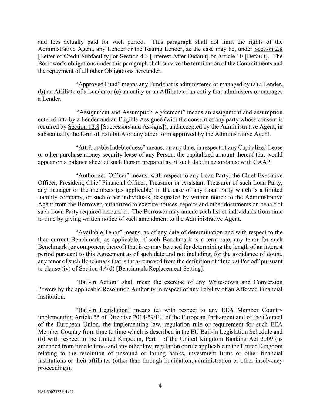 NAI-5002533191v11 4 and fees actually paid for such period. This paragraph shall not limit the rights of the Administrative Agent, any Lender or the Issuing Lender, as the case may be, under Section 2.8 [Letter of Credit Subfacility] or Section 4.3 [Interest After Default] or Article 10 [Default]. The Borrower’s obligations under this paragraph shall survive the termination of the Commitments and the repayment of all other Obligations hereunder. “Approved Fund” means any Fund that is administered or managed by (a) a Lender, (b) an Affiliate of a Lender or (c) an entity or an Affiliate of an entity that administers or manages a Lender. “Assignment and Assumption Agreement” means an assignment and assumption entered into by a Lender and an Eligible Assignee (with the consent of any party whose consent is required by Section 12.8 [Successors and Assigns]), and accepted by the Administrative Agent, in substantially the form of Exhibit A or any other form approved by the Administrative Agent. “Attributable Indebtedness” means, on any date, in respect of any Capitalized Lease or other purchase money security lease of any Person, the capitalized amount thereof that would appear on a balance sheet of such Person prepared as of such date in accordance with GAAP. “Authorized Officer” means, with respect to any Loan Party, the Chief Executive Officer, President, Chief Financial Officer, Treasurer or Assistant Treasurer of such Loan Party, any manager or the members (as applicable) in the case of any Loan Party which is a limited liability company, or such other individuals, designated by written notice to the Administrative Agent from the Borrower, authorized to execute notices, reports and other documents on behalf of such Loan Party required hereunder. The Borrower may amend such list of individuals from time to time by giving written notice of such amendment to the Administrative Agent. “Available Tenor” means, as of any date of determination and with respect to the then-current Benchmark, as applicable, if such Benchmark is a term rate, any tenor for such Benchmark (or component thereof) that is or may be used for determining the length of an interest period pursuant to this Agreement as of such date and not including, for the avoidance of doubt, any tenor of such Benchmark that is then-removed from the definition of “Interest Period” pursuant to clause (iv) of Section 4.4(d) [Benchmark Replacement Setting]. “Bail-In Action” shall mean the exercise of any Write-down and Conversion Powers by the applicable Resolution Authority in respect of any liability of an Affected Financial Institution. “Bail-In Legislation” means (a) with respect to any EEA Member Country implementing Article 55 of Directive 2014/59/EU of the European Parliament and of the Council of the European Union, the implementing law, regulation rule or requirement for such EEA Member Country from time to time which is described in the EU Bail-In Legislation Schedule and (b) with respect to the United Kingdom, Part I of the United Kingdom Banking Act 2009 (as amended from time to time) and any other law, regulation or rule applicable in the United Kingdom relating to the resolution of unsound or failing banks, investment firms or other financial institutions or their affiliates (other than through liquidation, administration or other insolvency proceedings).