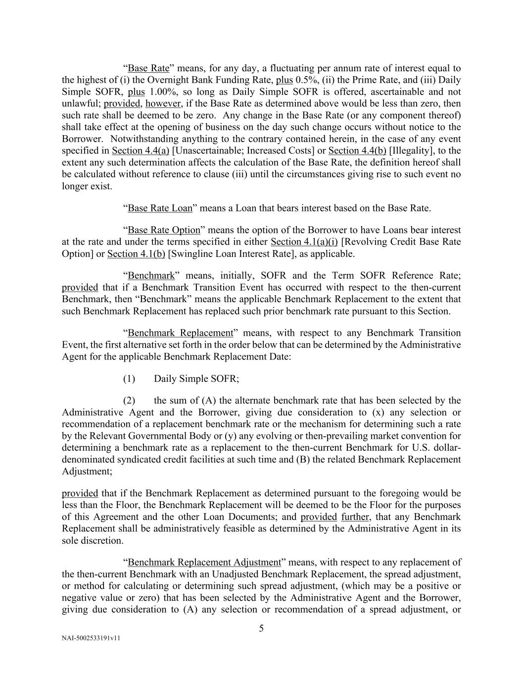 NAI-5002533191v11 5 “Base Rate” means, for any day, a fluctuating per annum rate of interest equal to the highest of (i) the Overnight Bank Funding Rate, plus 0.5%, (ii) the Prime Rate, and (iii) Daily Simple SOFR, plus 1.00%, so long as Daily Simple SOFR is offered, ascertainable and not unlawful; provided, however, if the Base Rate as determined above would be less than zero, then such rate shall be deemed to be zero. Any change in the Base Rate (or any component thereof) shall take effect at the opening of business on the day such change occurs without notice to the Borrower. Notwithstanding anything to the contrary contained herein, in the case of any event specified in Section 4.4(a) [Unascertainable; Increased Costs] or Section 4.4(b) [Illegality], to the extent any such determination affects the calculation of the Base Rate, the definition hereof shall be calculated without reference to clause (iii) until the circumstances giving rise to such event no longer exist. “Base Rate Loan” means a Loan that bears interest based on the Base Rate. “Base Rate Option” means the option of the Borrower to have Loans bear interest at the rate and under the terms specified in either Section 4.1(a)(i) [Revolving Credit Base Rate Option] or Section 4.1(b) [Swingline Loan Interest Rate], as applicable. “Benchmark” means, initially, SOFR and the Term SOFR Reference Rate; provided that if a Benchmark Transition Event has occurred with respect to the then-current Benchmark, then “Benchmark” means the applicable Benchmark Replacement to the extent that such Benchmark Replacement has replaced such prior benchmark rate pursuant to this Section. “Benchmark Replacement” means, with respect to any Benchmark Transition Event, the first alternative set forth in the order below that can be determined by the Administrative Agent for the applicable Benchmark Replacement Date: (1) Daily Simple SOFR; (2) the sum of (A) the alternate benchmark rate that has been selected by the Administrative Agent and the Borrower, giving due consideration to (x) any selection or recommendation of a replacement benchmark rate or the mechanism for determining such a rate by the Relevant Governmental Body or (y) any evolving or then-prevailing market convention for determining a benchmark rate as a replacement to the then-current Benchmark for U.S. dollar- denominated syndicated credit facilities at such time and (B) the related Benchmark Replacement Adjustment; provided that if the Benchmark Replacement as determined pursuant to the foregoing would be less than the Floor, the Benchmark Replacement will be deemed to be the Floor for the purposes of this Agreement and the other Loan Documents; and provided further, that any Benchmark Replacement shall be administratively feasible as determined by the Administrative Agent in its sole discretion. “Benchmark Replacement Adjustment” means, with respect to any replacement of the then-current Benchmark with an Unadjusted Benchmark Replacement, the spread adjustment, or method for calculating or determining such spread adjustment, (which may be a positive or negative value or zero) that has been selected by the Administrative Agent and the Borrower, giving due consideration to (A) any selection or recommendation of a spread adjustment, or