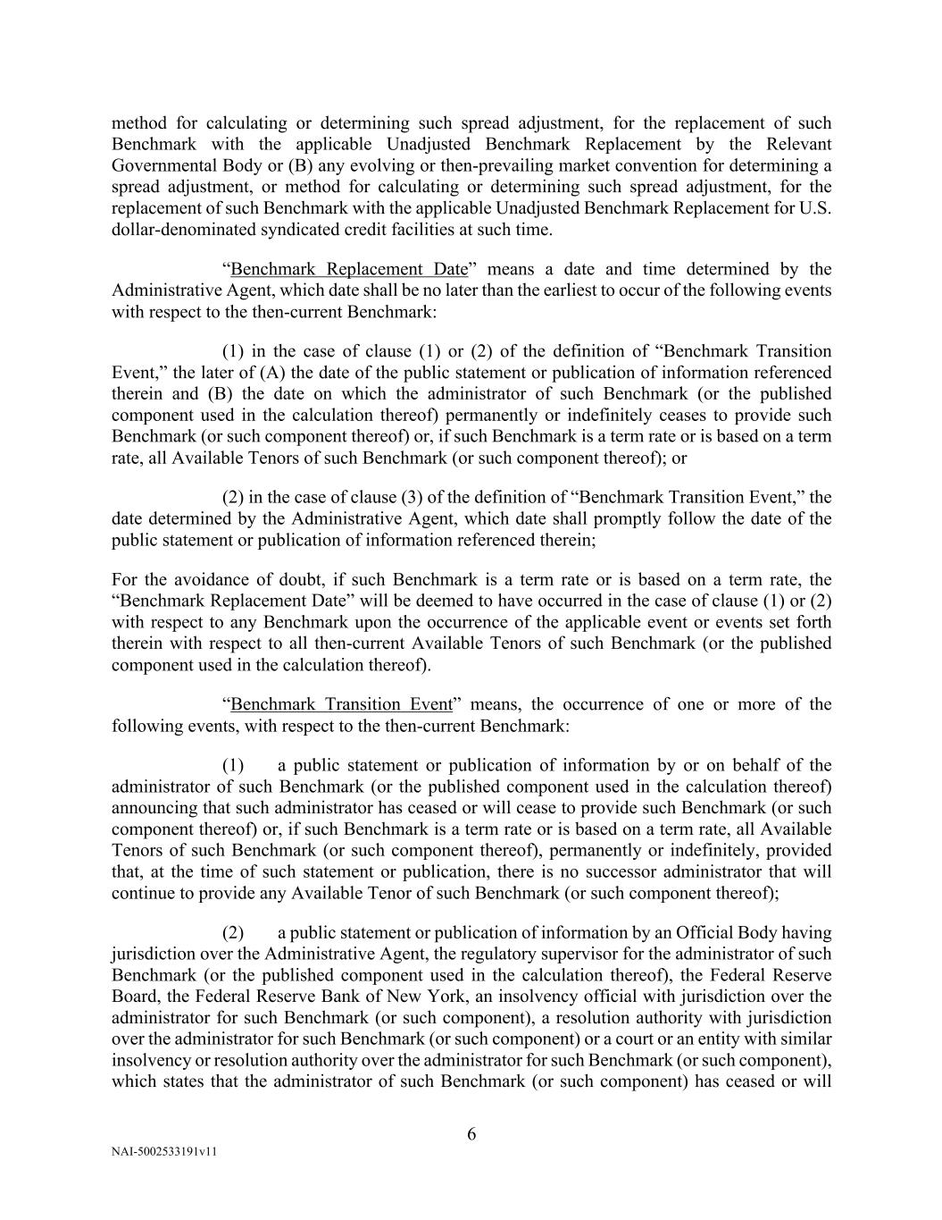 NAI-5002533191v11 6 method for calculating or determining such spread adjustment, for the replacement of such Benchmark with the applicable Unadjusted Benchmark Replacement by the Relevant Governmental Body or (B) any evolving or then-prevailing market convention for determining a spread adjustment, or method for calculating or determining such spread adjustment, for the replacement of such Benchmark with the applicable Unadjusted Benchmark Replacement for U.S. dollar-denominated syndicated credit facilities at such time. “Benchmark Replacement Date” means a date and time determined by the Administrative Agent, which date shall be no later than the earliest to occur of the following events with respect to the then-current Benchmark: (1) in the case of clause (1) or (2) of the definition of “Benchmark Transition Event,” the later of (A) the date of the public statement or publication of information referenced therein and (B) the date on which the administrator of such Benchmark (or the published component used in the calculation thereof) permanently or indefinitely ceases to provide such Benchmark (or such component thereof) or, if such Benchmark is a term rate or is based on a term rate, all Available Tenors of such Benchmark (or such component thereof); or (2) in the case of clause (3) of the definition of “Benchmark Transition Event,” the date determined by the Administrative Agent, which date shall promptly follow the date of the public statement or publication of information referenced therein; For the avoidance of doubt, if such Benchmark is a term rate or is based on a term rate, the “Benchmark Replacement Date” will be deemed to have occurred in the case of clause (1) or (2) with respect to any Benchmark upon the occurrence of the applicable event or events set forth therein with respect to all then-current Available Tenors of such Benchmark (or the published component used in the calculation thereof). “Benchmark Transition Event” means, the occurrence of one or more of the following events, with respect to the then-current Benchmark: (1) a public statement or publication of information by or on behalf of the administrator of such Benchmark (or the published component used in the calculation thereof) announcing that such administrator has ceased or will cease to provide such Benchmark (or such component thereof) or, if such Benchmark is a term rate or is based on a term rate, all Available Tenors of such Benchmark (or such component thereof), permanently or indefinitely, provided that, at the time of such statement or publication, there is no successor administrator that will continue to provide any Available Tenor of such Benchmark (or such component thereof); (2) a public statement or publication of information by an Official Body having jurisdiction over the Administrative Agent, the regulatory supervisor for the administrator of such Benchmark (or the published component used in the calculation thereof), the Federal Reserve Board, the Federal Reserve Bank of New York, an insolvency official with jurisdiction over the administrator for such Benchmark (or such component), a resolution authority with jurisdiction over the administrator for such Benchmark (or such component) or a court or an entity with similar insolvency or resolution authority over the administrator for such Benchmark (or such component), which states that the administrator of such Benchmark (or such component) has ceased or will