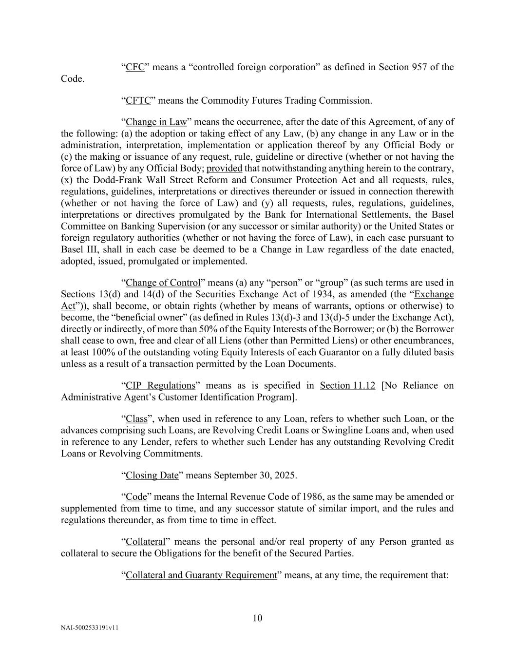 NAI-5002533191v11 10 “CFC” means a “controlled foreign corporation” as defined in Section 957 of the Code. “CFTC” means the Commodity Futures Trading Commission. “Change in Law” means the occurrence, after the date of this Agreement, of any of the following: (a) the adoption or taking effect of any Law, (b) any change in any Law or in the administration, interpretation, implementation or application thereof by any Official Body or (c) the making or issuance of any request, rule, guideline or directive (whether or not having the force of Law) by any Official Body; provided that notwithstanding anything herein to the contrary, (x) the Dodd-Frank Wall Street Reform and Consumer Protection Act and all requests, rules, regulations, guidelines, interpretations or directives thereunder or issued in connection therewith (whether or not having the force of Law) and (y) all requests, rules, regulations, guidelines, interpretations or directives promulgated by the Bank for International Settlements, the Basel Committee on Banking Supervision (or any successor or similar authority) or the United States or foreign regulatory authorities (whether or not having the force of Law), in each case pursuant to Basel III, shall in each case be deemed to be a Change in Law regardless of the date enacted, adopted, issued, promulgated or implemented. “Change of Control” means (a) any “person” or “group” (as such terms are used in Sections 13(d) and 14(d) of the Securities Exchange Act of 1934, as amended (the “Exchange Act”)), shall become, or obtain rights (whether by means of warrants, options or otherwise) to become, the “beneficial owner” (as defined in Rules 13(d)-3 and 13(d)-5 under the Exchange Act), directly or indirectly, of more than 50% of the Equity Interests of the Borrower; or (b) the Borrower shall cease to own, free and clear of all Liens (other than Permitted Liens) or other encumbrances, at least 100% of the outstanding voting Equity Interests of each Guarantor on a fully diluted basis unless as a result of a transaction permitted by the Loan Documents. “CIP Regulations” means as is specified in Section 11.12 [No Reliance on Administrative Agent’s Customer Identification Program]. “Class”, when used in reference to any Loan, refers to whether such Loan, or the advances comprising such Loans, are Revolving Credit Loans or Swingline Loans and, when used in reference to any Lender, refers to whether such Lender has any outstanding Revolving Credit Loans or Revolving Commitments. “Closing Date” means September 30, 2025. “Code” means the Internal Revenue Code of 1986, as the same may be amended or supplemented from time to time, and any successor statute of similar import, and the rules and regulations thereunder, as from time to time in effect. “Collateral” means the personal and/or real property of any Person granted as collateral to secure the Obligations for the benefit of the Secured Parties. “Collateral and Guaranty Requirement” means, at any time, the requirement that:
