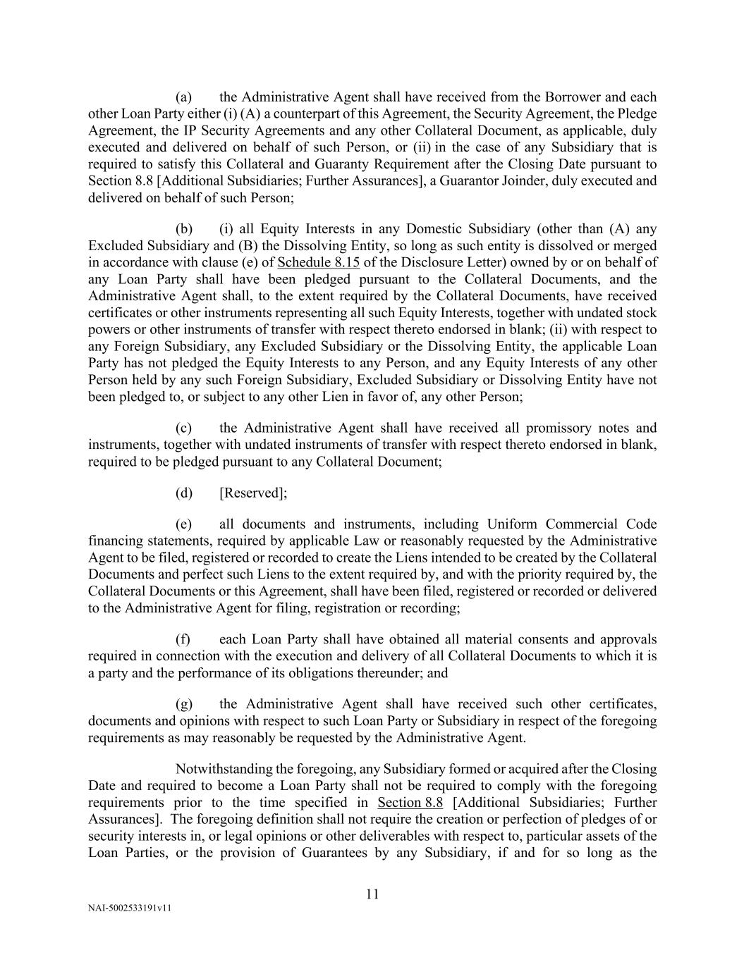 NAI-5002533191v11 11 (a) the Administrative Agent shall have received from the Borrower and each other Loan Party either (i) (A) a counterpart of this Agreement, the Security Agreement, the Pledge Agreement, the IP Security Agreements and any other Collateral Document, as applicable, duly executed and delivered on behalf of such Person, or (ii) in the case of any Subsidiary that is required to satisfy this Collateral and Guaranty Requirement after the Closing Date pursuant to Section 8.8 [Additional Subsidiaries; Further Assurances], a Guarantor Joinder, duly executed and delivered on behalf of such Person; (b) (i) all Equity Interests in any Domestic Subsidiary (other than (A) any Excluded Subsidiary and (B) the Dissolving Entity, so long as such entity is dissolved or merged in accordance with clause (e) of Schedule 8.15 of the Disclosure Letter) owned by or on behalf of any Loan Party shall have been pledged pursuant to the Collateral Documents, and the Administrative Agent shall, to the extent required by the Collateral Documents, have received certificates or other instruments representing all such Equity Interests, together with undated stock powers or other instruments of transfer with respect thereto endorsed in blank; (ii) with respect to any Foreign Subsidiary, any Excluded Subsidiary or the Dissolving Entity, the applicable Loan Party has not pledged the Equity Interests to any Person, and any Equity Interests of any other Person held by any such Foreign Subsidiary, Excluded Subsidiary or Dissolving Entity have not been pledged to, or subject to any other Lien in favor of, any other Person; (c) the Administrative Agent shall have received all promissory notes and instruments, together with undated instruments of transfer with respect thereto endorsed in blank, required to be pledged pursuant to any Collateral Document; (d) [Reserved]; (e) all documents and instruments, including Uniform Commercial Code financing statements, required by applicable Law or reasonably requested by the Administrative Agent to be filed, registered or recorded to create the Liens intended to be created by the Collateral Documents and perfect such Liens to the extent required by, and with the priority required by, the Collateral Documents or this Agreement, shall have been filed, registered or recorded or delivered to the Administrative Agent for filing, registration or recording; (f) each Loan Party shall have obtained all material consents and approvals required in connection with the execution and delivery of all Collateral Documents to which it is a party and the performance of its obligations thereunder; and (g) the Administrative Agent shall have received such other certificates, documents and opinions with respect to such Loan Party or Subsidiary in respect of the foregoing requirements as may reasonably be requested by the Administrative Agent. Notwithstanding the foregoing, any Subsidiary formed or acquired after the Closing Date and required to become a Loan Party shall not be required to comply with the foregoing requirements prior to the time specified in Section 8.8 [Additional Subsidiaries; Further Assurances]. The foregoing definition shall not require the creation or perfection of pledges of or security interests in, or legal opinions or other deliverables with respect to, particular assets of the Loan Parties, or the provision of Guarantees by any Subsidiary, if and for so long as the