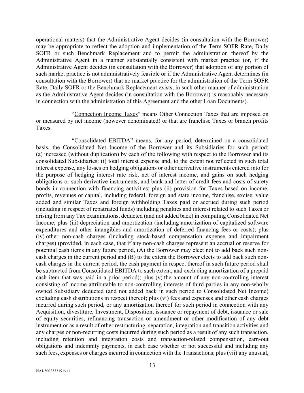 NAI-5002533191v11 13 operational matters) that the Administrative Agent decides (in consultation with the Borrower) may be appropriate to reflect the adoption and implementation of the Term SOFR Rate, Daily SOFR or such Benchmark Replacement and to permit the administration thereof by the Administrative Agent in a manner substantially consistent with market practice (or, if the Administrative Agent decides (in consultation with the Borrower) that adoption of any portion of such market practice is not administratively feasible or if the Administrative Agent determines (in consultation with the Borrower) that no market practice for the administration of the Term SOFR Rate, Daily SOFR or the Benchmark Replacement exists, in such other manner of administration as the Administrative Agent decides (in consultation with the Borrower) is reasonably necessary in connection with the administration of this Agreement and the other Loan Documents). “Connection Income Taxes” means Other Connection Taxes that are imposed on or measured by net income (however denominated) or that are franchise Taxes or branch profits Taxes. “Consolidated EBITDA” means, for any period, determined on a consolidated basis, the Consolidated Net Income of the Borrower and its Subsidiaries for such period: (a) increased (without duplication) by each of the following with respect to the Borrower and its consolidated Subsidiaries: (i) total interest expense and, to the extent not reflected in such total interest expense, any losses on hedging obligations or other derivative instruments entered into for the purpose of hedging interest rate risk, net of interest income, and gains on such hedging obligations or such derivative instruments, and bank and letter of credit fees and costs of surety bonds in connection with financing activities; plus (ii) provision for Taxes based on income, profits, revenues or capital, including federal, foreign and state income, franchise, excise, value added and similar Taxes and foreign withholding Taxes paid or accrued during such period (including in respect of repatriated funds) including penalties and interest related to such Taxes or arising from any Tax examinations, deducted (and not added back) in computing Consolidated Net Income; plus (iii) depreciation and amortization (including amortization of capitalized software expenditures and other intangibles and amortization of deferred financing fees or costs); plus (iv) other non-cash charges (including stock-based compensation expense and impairment charges) (provided, in each case, that if any non-cash charges represent an accrual or reserve for potential cash items in any future period, (A) the Borrower may elect not to add back such non- cash charges in the current period and (B) to the extent the Borrower elects to add back such non- cash charges in the current period, the cash payment in respect thereof in such future period shall be subtracted from Consolidated EBITDA to such extent, and excluding amortization of a prepaid cash item that was paid in a prior period); plus (v) the amount of any non-controlling interest consisting of income attributable to non-controlling interests of third parties in any non-wholly owned Subsidiary deducted (and not added back in such period to Consolidated Net Income) excluding cash distributions in respect thereof; plus (vi) fees and expenses and other cash charges incurred during such period, or any amortization thereof for such period in connection with any Acquisition, divestiture, Investment, Disposition, issuance or repayment of debt, issuance or sale of equity securities, refinancing transaction or amendment or other modification of any debt instrument or as a result of other restructuring, separation, integration and transition activities and any charges or non-recurring costs incurred during such period as a result of any such transaction, including retention and integration costs and transaction-related compensation, earn-out obligations and indemnity payments, in each case whether or not successful and including any such fees, expenses or charges incurred in connection with the Transactions; plus (vii) any unusual,