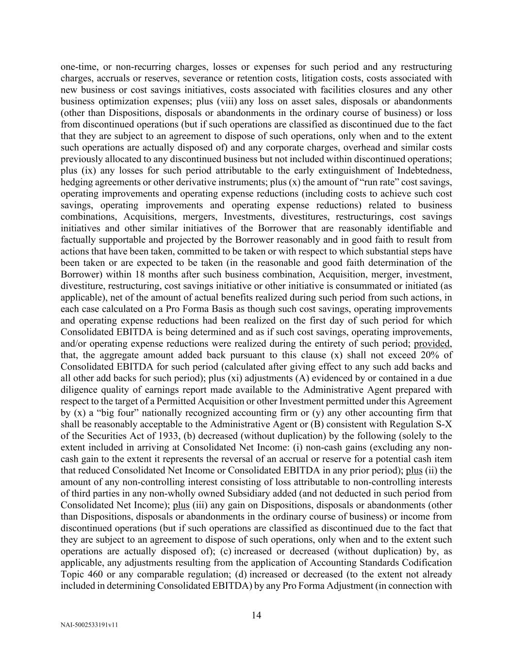 NAI-5002533191v11 14 one-time, or non-recurring charges, losses or expenses for such period and any restructuring charges, accruals or reserves, severance or retention costs, litigation costs, costs associated with new business or cost savings initiatives, costs associated with facilities closures and any other business optimization expenses; plus (viii) any loss on asset sales, disposals or abandonments (other than Dispositions, disposals or abandonments in the ordinary course of business) or loss from discontinued operations (but if such operations are classified as discontinued due to the fact that they are subject to an agreement to dispose of such operations, only when and to the extent such operations are actually disposed of) and any corporate charges, overhead and similar costs previously allocated to any discontinued business but not included within discontinued operations; plus (ix) any losses for such period attributable to the early extinguishment of Indebtedness, hedging agreements or other derivative instruments; plus (x) the amount of “run rate” cost savings, operating improvements and operating expense reductions (including costs to achieve such cost savings, operating improvements and operating expense reductions) related to business combinations, Acquisitions, mergers, Investments, divestitures, restructurings, cost savings initiatives and other similar initiatives of the Borrower that are reasonably identifiable and factually supportable and projected by the Borrower reasonably and in good faith to result from actions that have been taken, committed to be taken or with respect to which substantial steps have been taken or are expected to be taken (in the reasonable and good faith determination of the Borrower) within 18 months after such business combination, Acquisition, merger, investment, divestiture, restructuring, cost savings initiative or other initiative is consummated or initiated (as applicable), net of the amount of actual benefits realized during such period from such actions, in each case calculated on a Pro Forma Basis as though such cost savings, operating improvements and operating expense reductions had been realized on the first day of such period for which Consolidated EBITDA is being determined and as if such cost savings, operating improvements, and/or operating expense reductions were realized during the entirety of such period; provided, that, the aggregate amount added back pursuant to this clause (x) shall not exceed 20% of Consolidated EBITDA for such period (calculated after giving effect to any such add backs and all other add backs for such period); plus (xi) adjustments (A) evidenced by or contained in a due diligence quality of earnings report made available to the Administrative Agent prepared with respect to the target of a Permitted Acquisition or other Investment permitted under this Agreement by (x) a “big four” nationally recognized accounting firm or (y) any other accounting firm that shall be reasonably acceptable to the Administrative Agent or (B) consistent with Regulation S-X of the Securities Act of 1933, (b) decreased (without duplication) by the following (solely to the extent included in arriving at Consolidated Net Income: (i) non-cash gains (excluding any non- cash gain to the extent it represents the reversal of an accrual or reserve for a potential cash item that reduced Consolidated Net Income or Consolidated EBITDA in any prior period); plus (ii) the amount of any non-controlling interest consisting of loss attributable to non-controlling interests of third parties in any non-wholly owned Subsidiary added (and not deducted in such period from Consolidated Net Income); plus (iii) any gain on Dispositions, disposals or abandonments (other than Dispositions, disposals or abandonments in the ordinary course of business) or income from discontinued operations (but if such operations are classified as discontinued due to the fact that they are subject to an agreement to dispose of such operations, only when and to the extent such operations are actually disposed of); (c) increased or decreased (without duplication) by, as applicable, any adjustments resulting from the application of Accounting Standards Codification Topic 460 or any comparable regulation; (d) increased or decreased (to the extent not already included in determining Consolidated EBITDA) by any Pro Forma Adjustment (in connection with