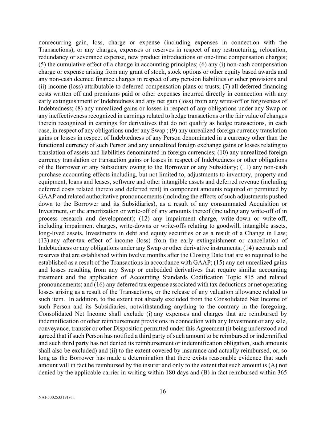 NAI-5002533191v11 16 nonrecurring gain, loss, charge or expense (including expenses in connection with the Transactions), or any charges, expenses or reserves in respect of any restructuring, relocation, redundancy or severance expense, new product introductions or one-time compensation charges; (5) the cumulative effect of a change in accounting principles; (6) any (i) non-cash compensation charge or expense arising from any grant of stock, stock options or other equity based awards and any non-cash deemed finance charges in respect of any pension liabilities or other provisions and (ii) income (loss) attributable to deferred compensation plans or trusts; (7) all deferred financing costs written off and premiums paid or other expenses incurred directly in connection with any early extinguishment of Indebtedness and any net gain (loss) from any write-off or forgiveness of Indebtedness; (8) any unrealized gains or losses in respect of any obligations under any Swap or any ineffectiveness recognized in earnings related to hedge transactions or the fair value of changes therein recognized in earnings for derivatives that do not qualify as hedge transactions, in each case, in respect of any obligations under any Swap ; (9) any unrealized foreign currency translation gains or losses in respect of Indebtedness of any Person denominated in a currency other than the functional currency of such Person and any unrealized foreign exchange gains or losses relating to translation of assets and liabilities denominated in foreign currencies; (10) any unrealized foreign currency translation or transaction gains or losses in respect of Indebtedness or other obligations of the Borrower or any Subsidiary owing to the Borrower or any Subsidiary; (11) any non-cash purchase accounting effects including, but not limited to, adjustments to inventory, property and equipment, loans and leases, software and other intangible assets and deferred revenue (including deferred costs related thereto and deferred rent) in component amounts required or permitted by GAAP and related authoritative pronouncements (including the effects of such adjustments pushed down to the Borrower and its Subsidiaries), as a result of any consummated Acquisition or Investment, or the amortization or write-off of any amounts thereof (including any write-off of in process research and development); (12) any impairment charge, write-down or write-off, including impairment charges, write-downs or write-offs relating to goodwill, intangible assets, long-lived assets, Investments in debt and equity securities or as a result of a Change in Law; (13) any after-tax effect of income (loss) from the early extinguishment or cancellation of Indebtedness or any obligations under any Swap or other derivative instruments; (14) accruals and reserves that are established within twelve months after the Closing Date that are so required to be established as a result of the Transactions in accordance with GAAP; (15) any net unrealized gains and losses resulting from any Swap or embedded derivatives that require similar accounting treatment and the application of Accounting Standards Codification Topic 815 and related pronouncements; and (16) any deferred tax expense associated with tax deductions or net operating losses arising as a result of the Transactions, or the release of any valuation allowance related to such item. In addition, to the extent not already excluded from the Consolidated Net Income of such Person and its Subsidiaries, notwithstanding anything to the contrary in the foregoing, Consolidated Net Income shall exclude (i) any expenses and charges that are reimbursed by indemnification or other reimbursement provisions in connection with any Investment or any sale, conveyance, transfer or other Disposition permitted under this Agreement (it being understood and agreed that if such Person has notified a third party of such amount to be reimbursed or indemnified and such third party has not denied its reimbursement or indemnification obligation, such amounts shall also be excluded) and (ii) to the extent covered by insurance and actually reimbursed, or, so long as the Borrower has made a determination that there exists reasonable evidence that such amount will in fact be reimbursed by the insurer and only to the extent that such amount is (A) not denied by the applicable carrier in writing within 180 days and (B) in fact reimbursed within 365
