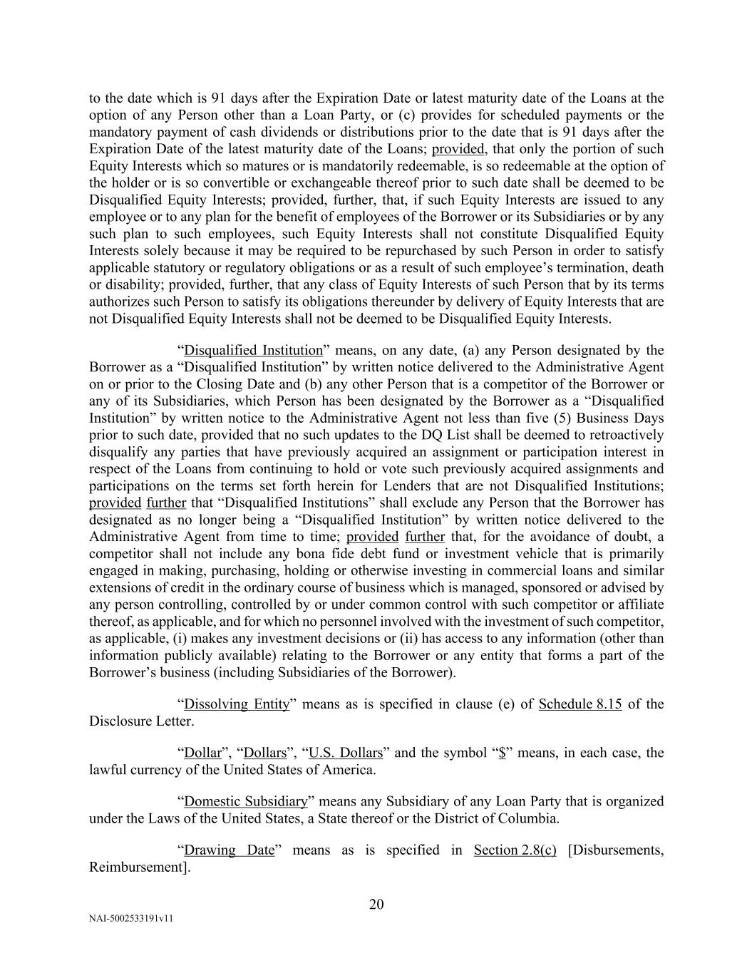 NAI-5002533191v11 20 to the date which is 91 days after the Expiration Date or latest maturity date of the Loans at the option of any Person other than a Loan Party, or (c) provides for scheduled payments or the mandatory payment of cash dividends or distributions prior to the date that is 91 days after the Expiration Date of the latest maturity date of the Loans; provided, that only the portion of such Equity Interests which so matures or is mandatorily redeemable, is so redeemable at the option of the holder or is so convertible or exchangeable thereof prior to such date shall be deemed to be Disqualified Equity Interests; provided, further, that, if such Equity Interests are issued to any employee or to any plan for the benefit of employees of the Borrower or its Subsidiaries or by any such plan to such employees, such Equity Interests shall not constitute Disqualified Equity Interests solely because it may be required to be repurchased by such Person in order to satisfy applicable statutory or regulatory obligations or as a result of such employee’s termination, death or disability; provided, further, that any class of Equity Interests of such Person that by its terms authorizes such Person to satisfy its obligations thereunder by delivery of Equity Interests that are not Disqualified Equity Interests shall not be deemed to be Disqualified Equity Interests. “Disqualified Institution” means, on any date, (a) any Person designated by the Borrower as a “Disqualified Institution” by written notice delivered to the Administrative Agent on or prior to the Closing Date and (b) any other Person that is a competitor of the Borrower or any of its Subsidiaries, which Person has been designated by the Borrower as a “Disqualified Institution” by written notice to the Administrative Agent not less than five (5) Business Days prior to such date, provided that no such updates to the DQ List shall be deemed to retroactively disqualify any parties that have previously acquired an assignment or participation interest in respect of the Loans from continuing to hold or vote such previously acquired assignments and participations on the terms set forth herein for Lenders that are not Disqualified Institutions; provided further that “Disqualified Institutions” shall exclude any Person that the Borrower has designated as no longer being a “Disqualified Institution” by written notice delivered to the Administrative Agent from time to time; provided further that, for the avoidance of doubt, a competitor shall not include any bona fide debt fund or investment vehicle that is primarily engaged in making, purchasing, holding or otherwise investing in commercial loans and similar extensions of credit in the ordinary course of business which is managed, sponsored or advised by any person controlling, controlled by or under common control with such competitor or affiliate thereof, as applicable, and for which no personnel involved with the investment of such competitor, as applicable, (i) makes any investment decisions or (ii) has access to any information (other than information publicly available) relating to the Borrower or any entity that forms a part of the Borrower’s business (including Subsidiaries of the Borrower). “Dissolving Entity” means as is specified in clause (e) of Schedule 8.15 of the Disclosure Letter. “Dollar”, “Dollars”, “U.S. Dollars” and the symbol “$” means, in each case, the lawful currency of the United States of America. “Domestic Subsidiary” means any Subsidiary of any Loan Party that is organized under the Laws of the United States, a State thereof or the District of Columbia. “Drawing Date” means as is specified in Section 2.8(c) [Disbursements, Reimbursement].
